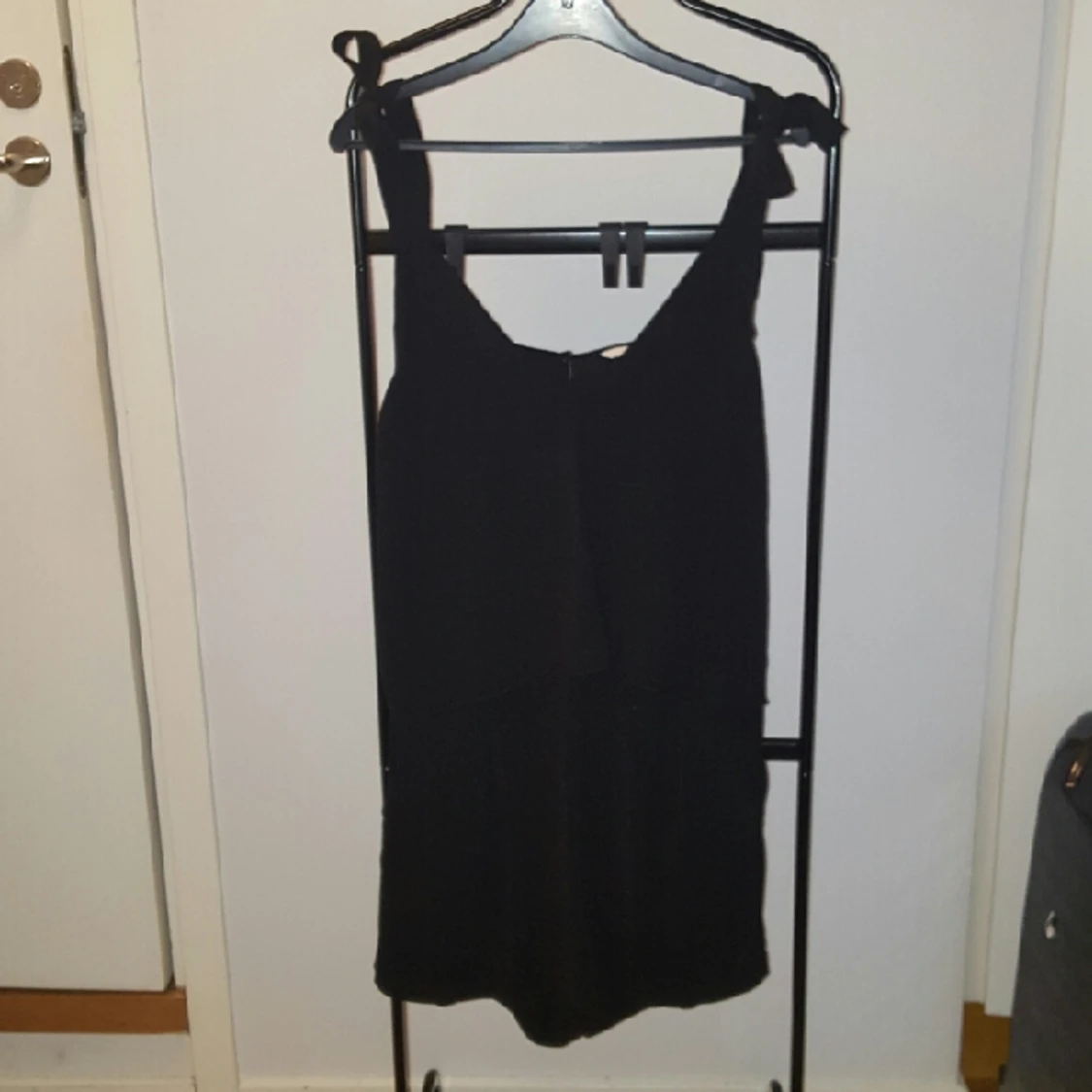 Svart byxdress med knytband över axlarna och en öppning i ryggen och blixtlås bak.