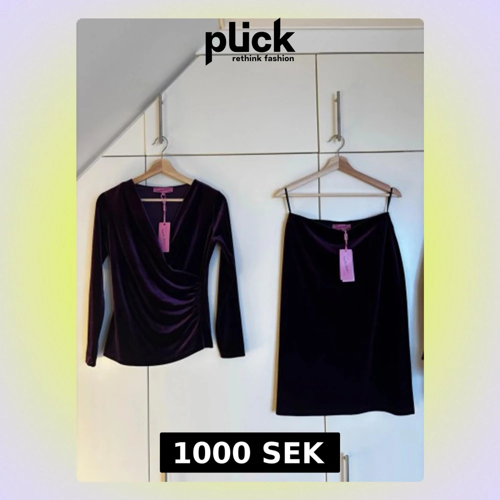 Supersnygg lila sammettop och kjol från Camilla Thulin. Topen har omlottliv med v-ringning, långa ärmar. Kjolen är rak. Mjuk, glansig finish som ger en lyxig känsla. Nya oanvända!