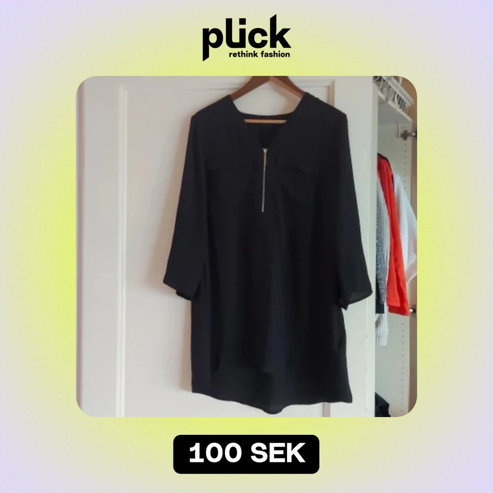 Säljer en stilren svart klänning från Cellbes. Den har en dragkedja framtill och trekvartsärmar, vilket gör den perfekt för både vardag och fest. Klänningen är i ett mjukt och bekvämt material, vilket gör den skön att bära hela dagen.