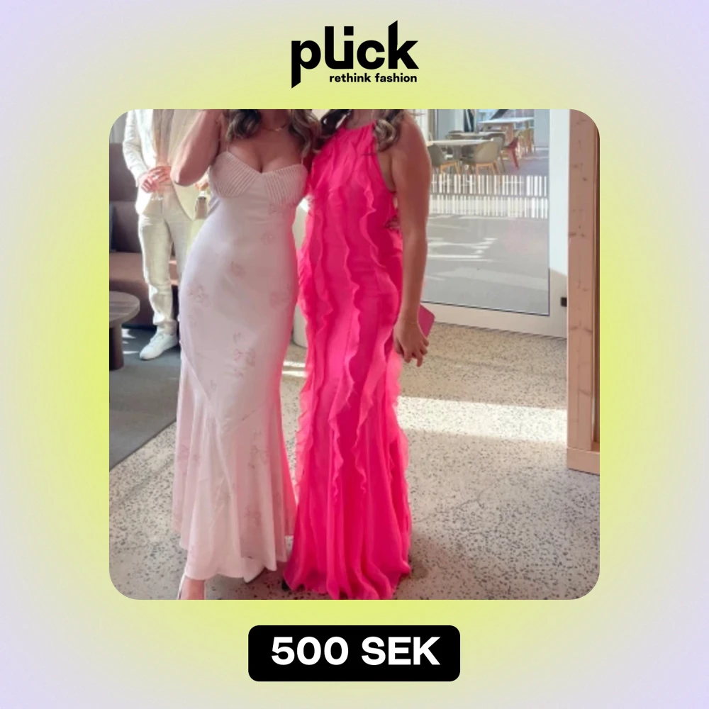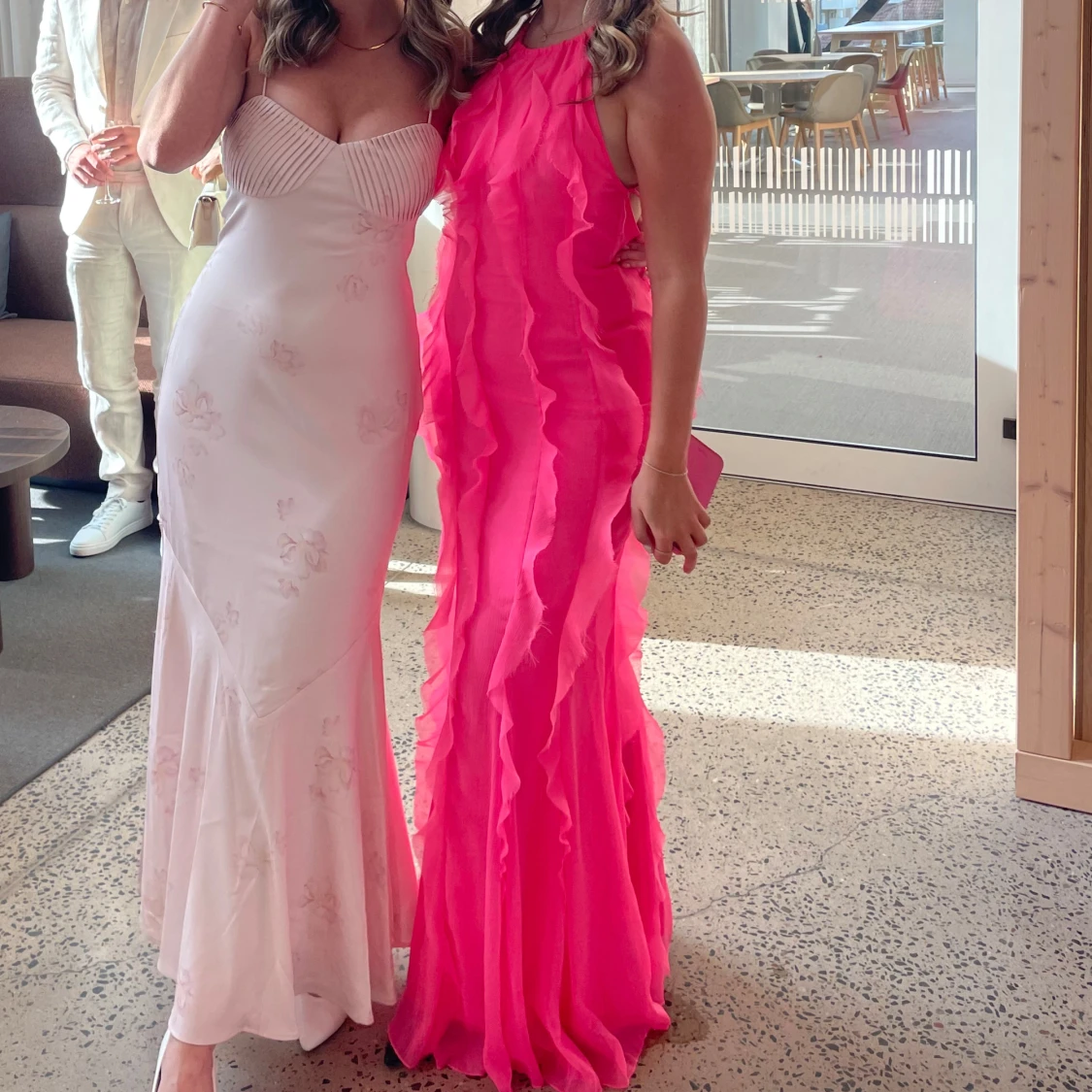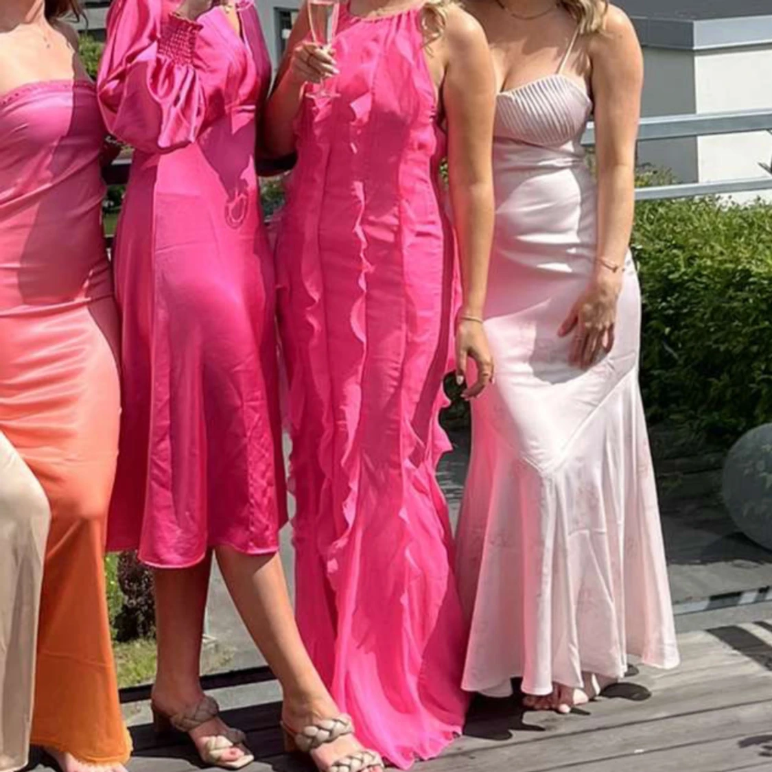 Cerise-rosa klänning med volanger. Storlek 38, men funkar om du är en storlek 36 då man kan anpassa banden. Köpt från Asos för cirka 1100kr, använd en gång.