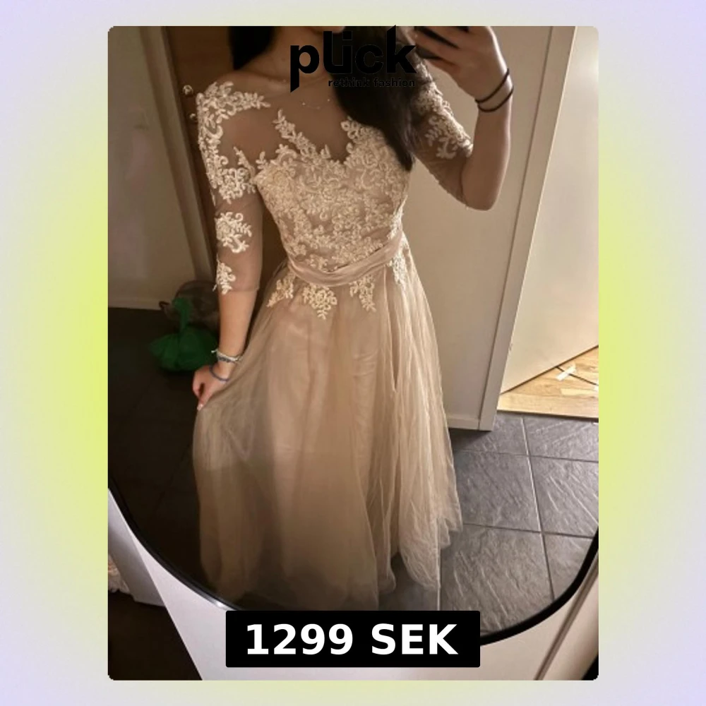 Säljer en elegant champagnefärgad balklänning med vackra spetsdetaljer och broderade blommor på överdelen. Klänningen har trekvartsärmar i transparent tyg och ett flytande, skirt kjolparti som ger en drömmig look. Perfekt för bal eller student.🤍🤍