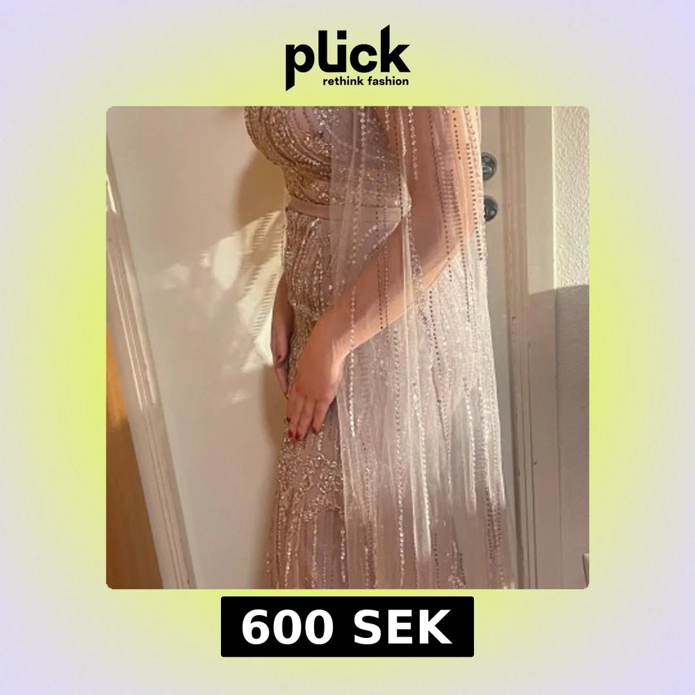 Magisk långklänning i champagne med glittriga paljetter och vackra detaljer. Klänningen har figurnära passform, v-ringning och transparent cape med glittrande ränder. Perfekt för dig som vill sticka ut och glänsa på bal eller fest.