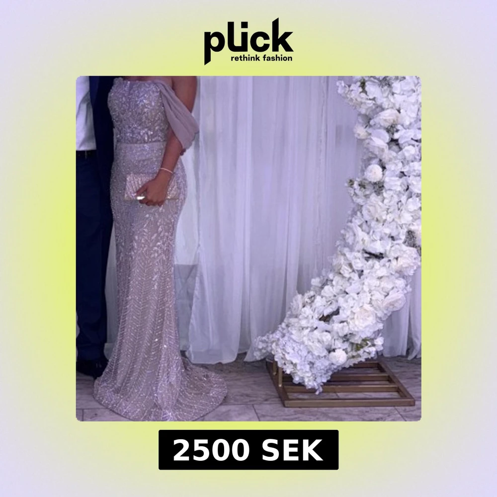 Säljer en champagnefärgad långklänning med glittriga paljettdetaljer och ett elegant mönster. Klänningen är axelbandslös och har en figurnära passform. Perfekt för bal eller fest.