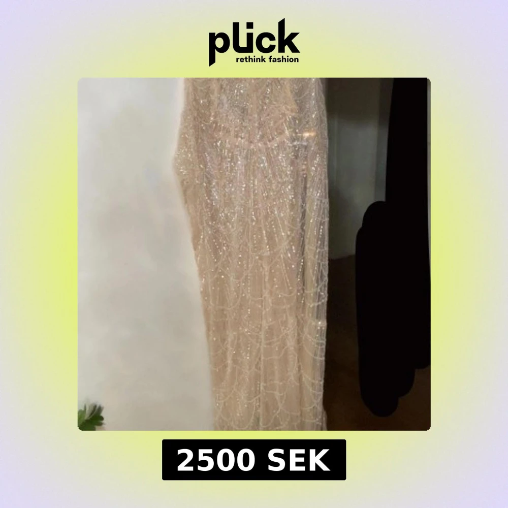 Magisk långklänning i champagnefärg med glittriga paljetter och pärlbroderier över hela tyget. Klänningen har snörning i ryggen och en elegant omlottkänsla framtill. Perfekt för bal eller nyår, med en lyxig och glamorös känsla. Ansvänd endast för att kolla storlek