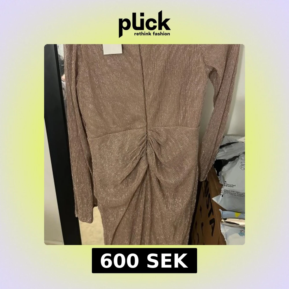 Supersnygg långklänning från Maniju i champagnefärgat glittrigt tyg. Klänningen har v-ringning, långa ärmar och omlott-detalj framtill med snygg drapering. Perfekt för dig som vill sticka ut med en elegant och trendig look. Helt ny och oanvänd. Köpte den för 1500 säljer den för 600