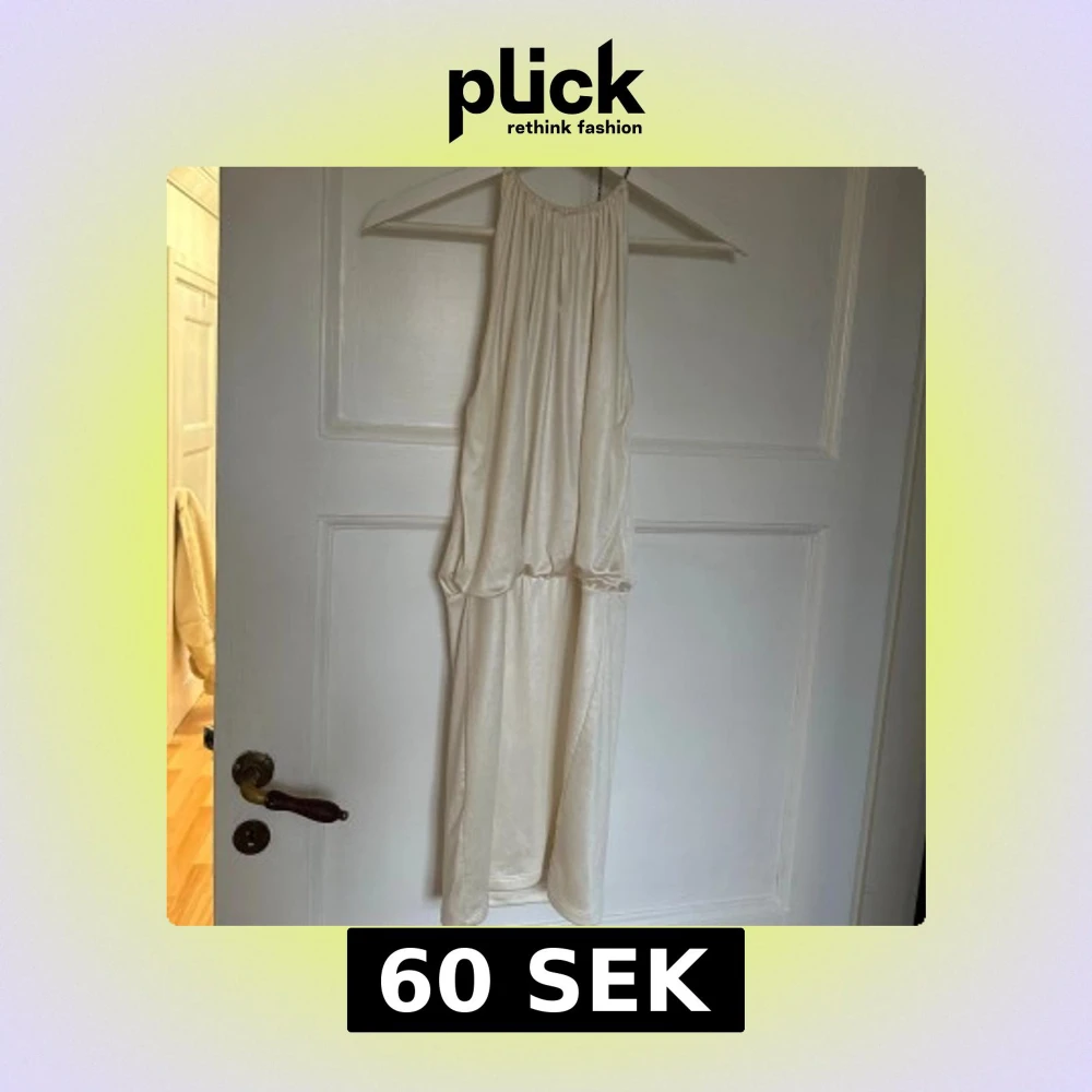 Säljer en champagnefärgad kortklänning från Forever21 med halterneck och öppen rygg. Klänningen har ett glansigt tyg och en lös, draperad passform som ger en cool och avslappnad vibe. Perfekt för dig som gillar minimalistisk stil med en touch av lyx.