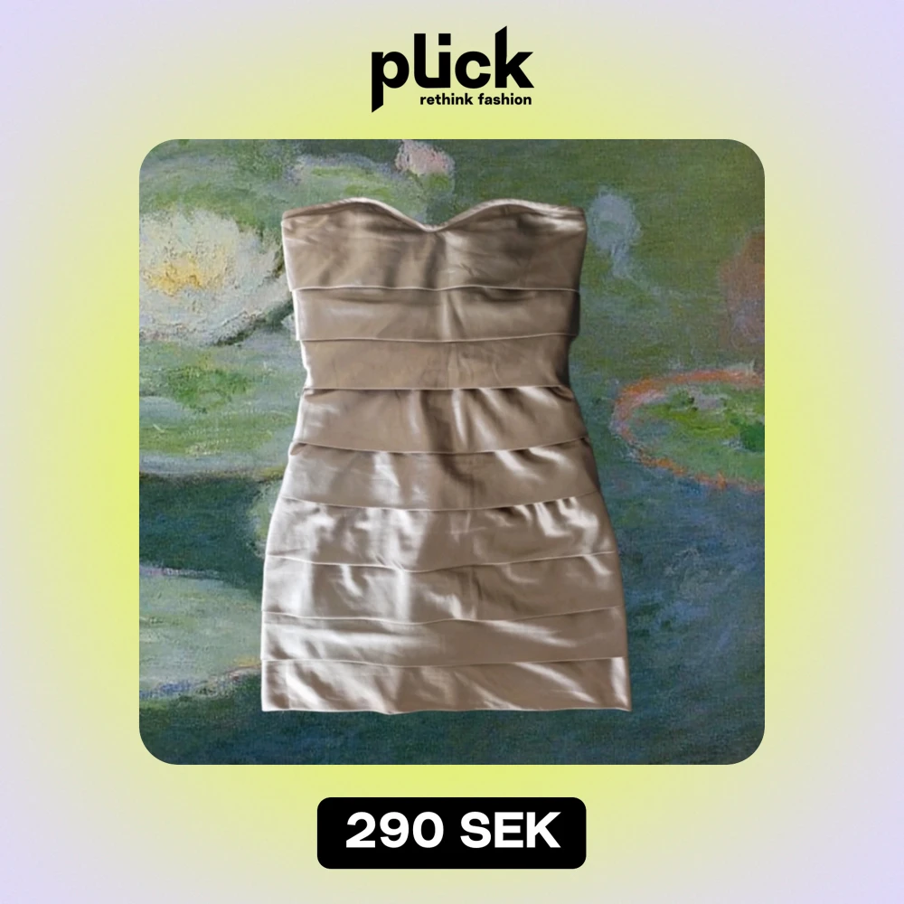 Snygg champagnefärgad klänning från Carryformal i silkes material. Den är axelbandslös och har en dragkedja På ryggen