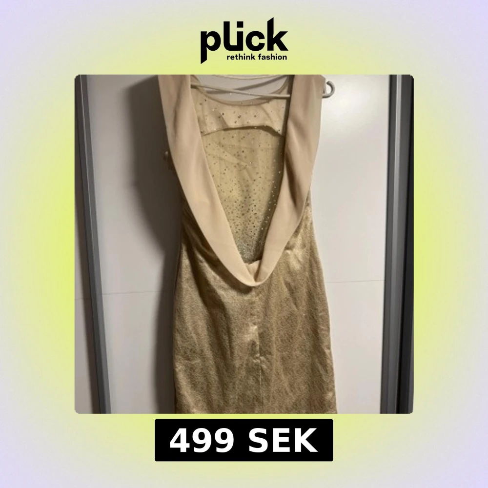 Säljer en elegant kortklänning i champagnefärg med glittriga paljettdetaljer framtill. Klänningen har en djup v-ringning med bred krage och är ärmlös. Materialet har en lyxig satinliknande finish som ger en exklusiv känsla. Perfekt för dig som vill sticka ut.