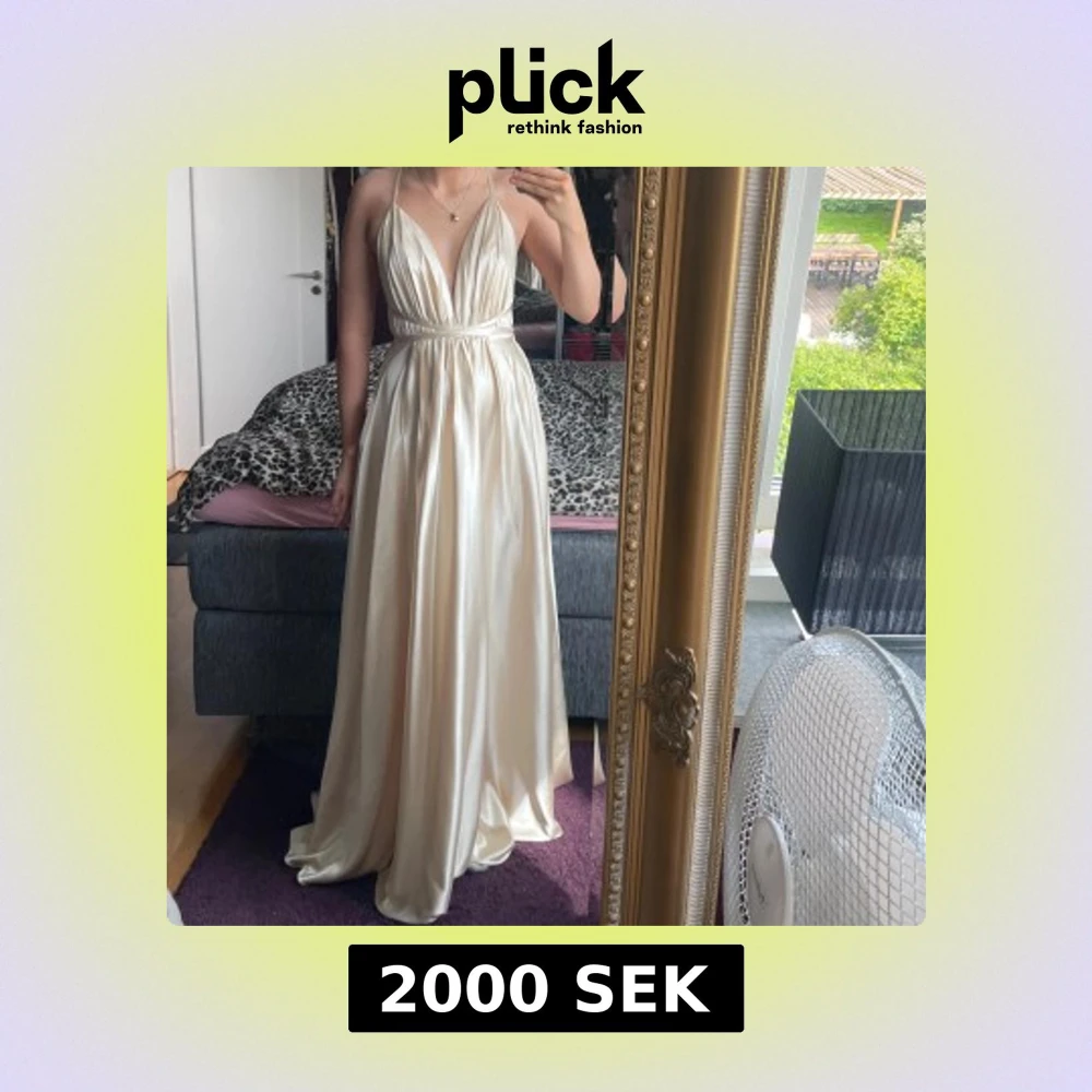 Elegant långklänning i skimrande champagnefärgad satin med djup v-ringning och tunna axelband som korsas i ryggen.Klänningen har markerad midja och ett vackert fall.Perfekt för bal eller student!Klänningen är från butiken ivoryfield i sthlm.Klänningen säljs för 2499kr och jag säljer den för att min rätt till retur har gått ut och behöver få klänningen såld.Aldrig använd,en sprillans ny nyhet och så fin.Storlek 34/2men passar mig som bär storlek S.Kontakta för fler bilder,vinklar &mer information