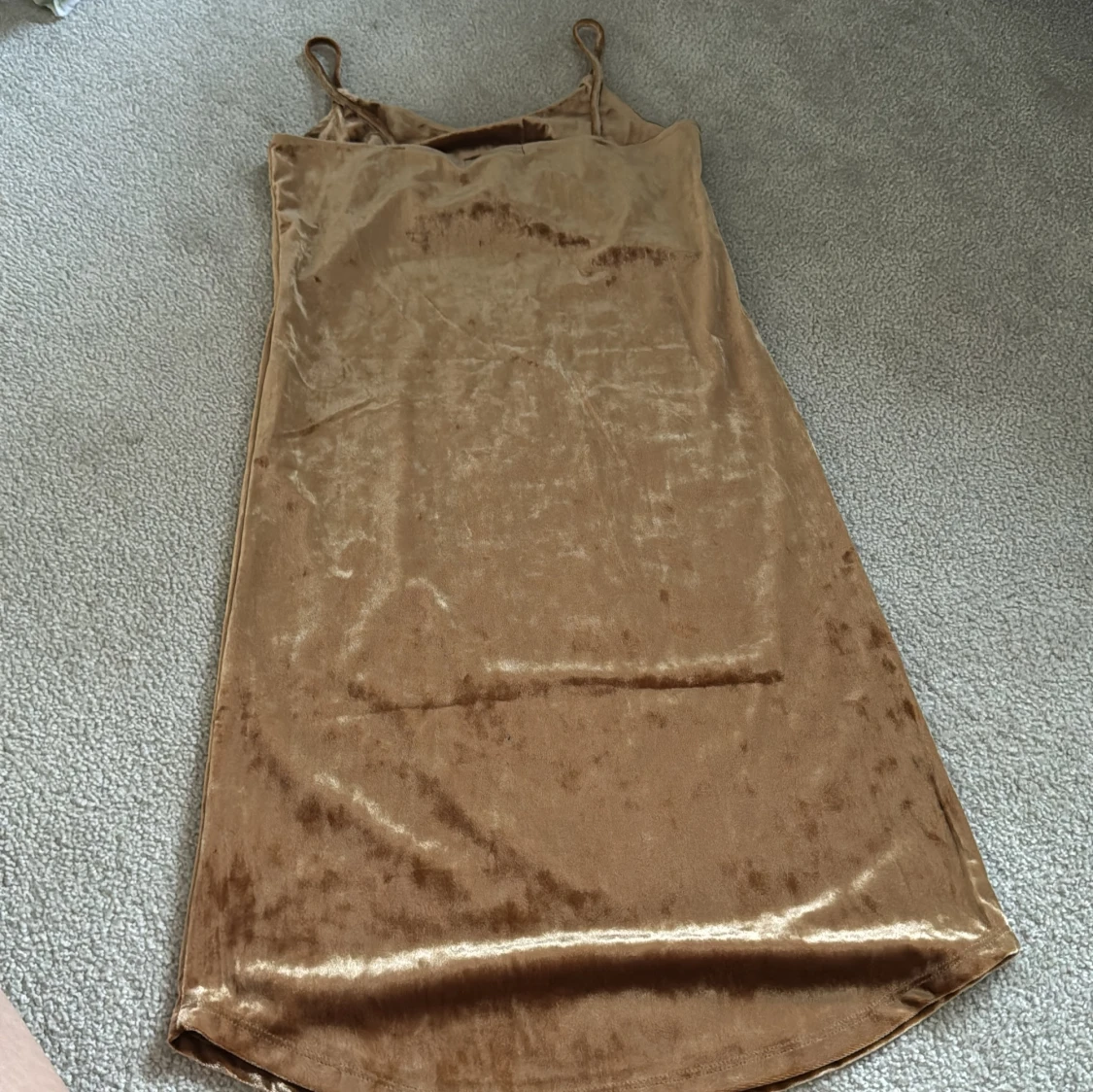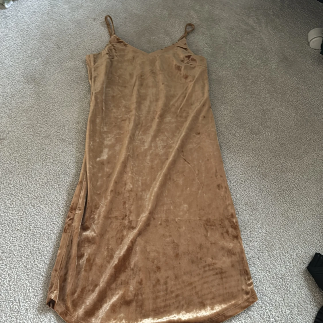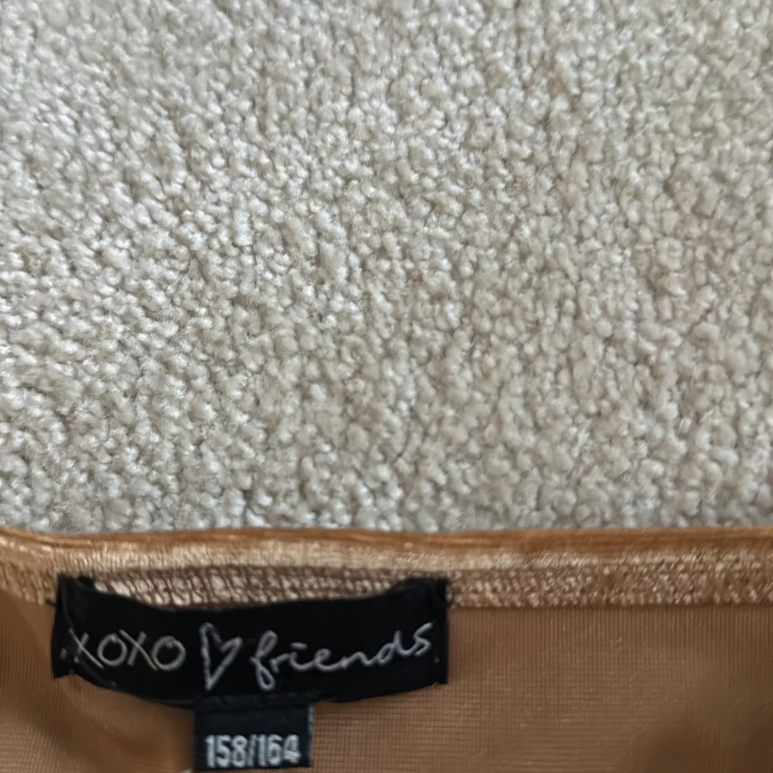 Säljer en glansig och elegant långklänning i champagnefärg från XOXO Friends. Klänningen har smala axelband och en mjuk, följsam passform. Perfekt för dig som vill ha en stilren och trendig look.