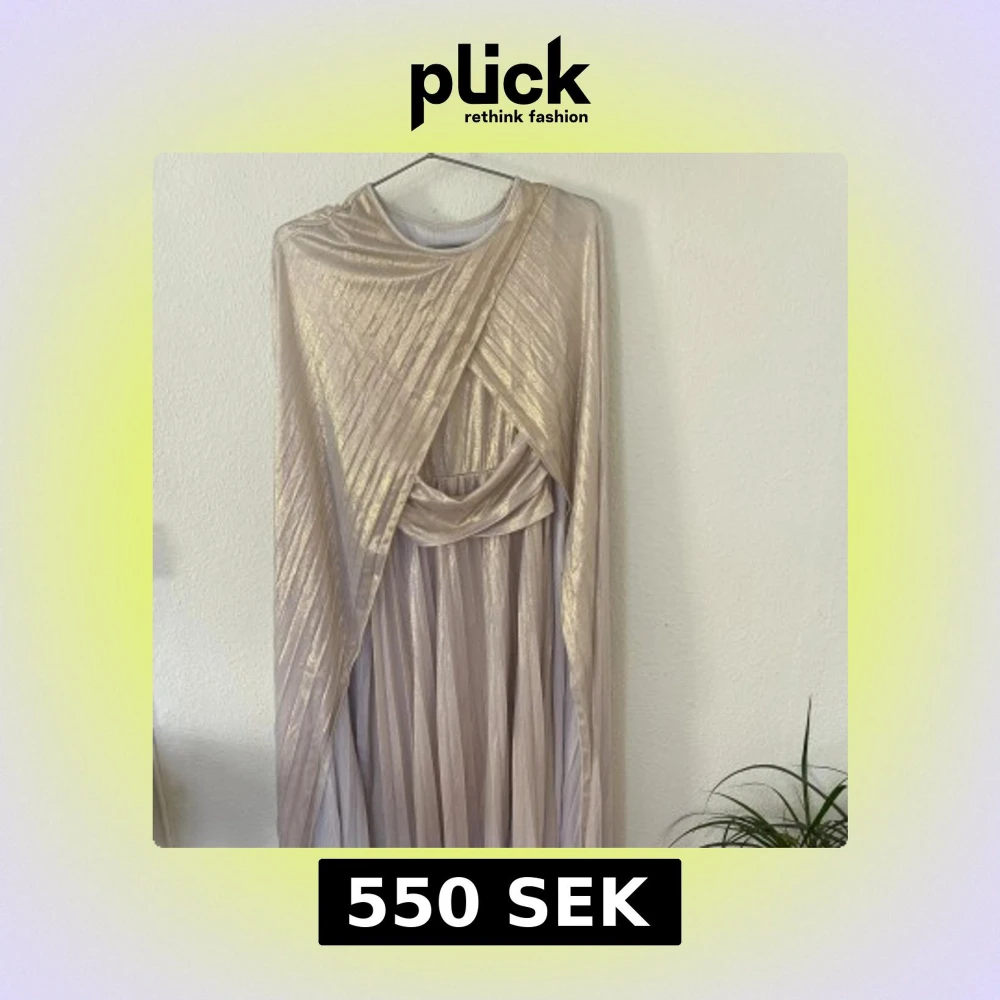Säljer en maxilång klänning i skimrande champagnefärgat tyg med plisserade detaljer och omlottliknande överdel. Klänningen har en cape-effekt över axlarna och ett elegant fall. Perfekt för dig som vill sticka ut med en unik och lyxig look.