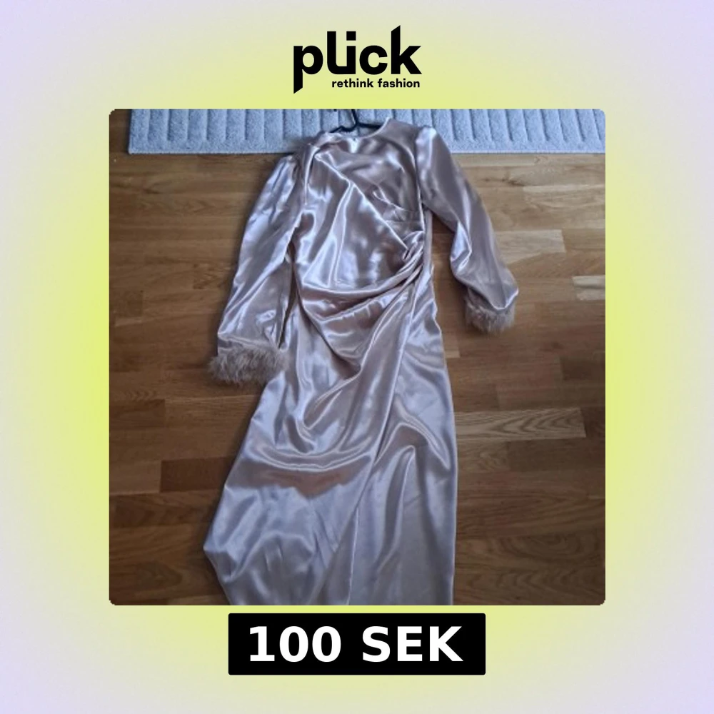 Säljer en elegant långklänning i champagnefärgad satin med långa ärmar och fjäderdetaljer vid ärmsluten. Klänningen har drapering framtill och knappar längs ryggen. Perfekt för dig som vill sticka ut på festen!