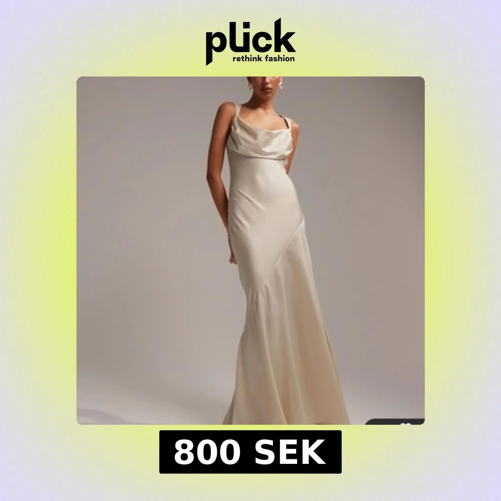 Elegant champagnefärgad långklänning med smala axelband och öppen rygg. Klänningen har en draperad halslinje och knytning i ryggen för en sofistikerad look. Köpt på asos för drygt 1000kr