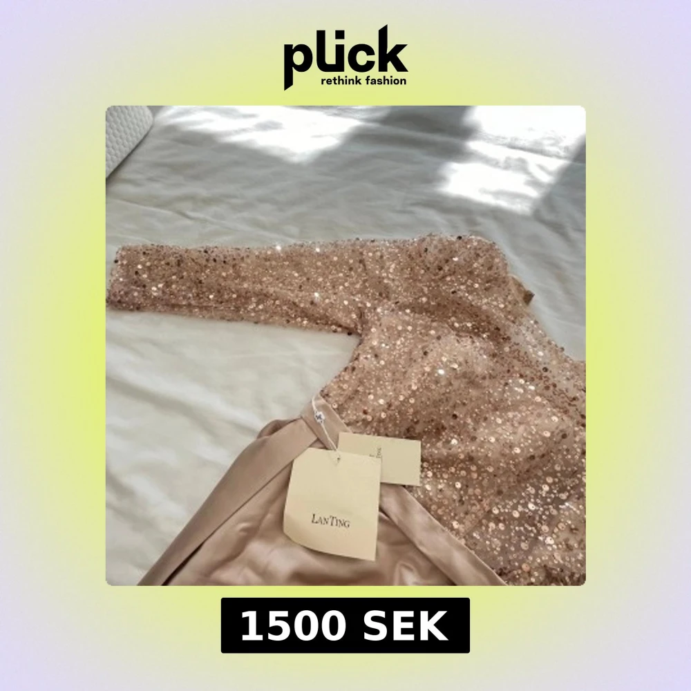 Säljer en elegant champagnefärgad långklänning från LanTing med glittrig överdel täckt av paljetter och långärmade ärmar. Kjolen är i mjuk satin med vacker drapering och markerad midja. Perfekt för dig som vill sticka ut med lyxig stil och glans.