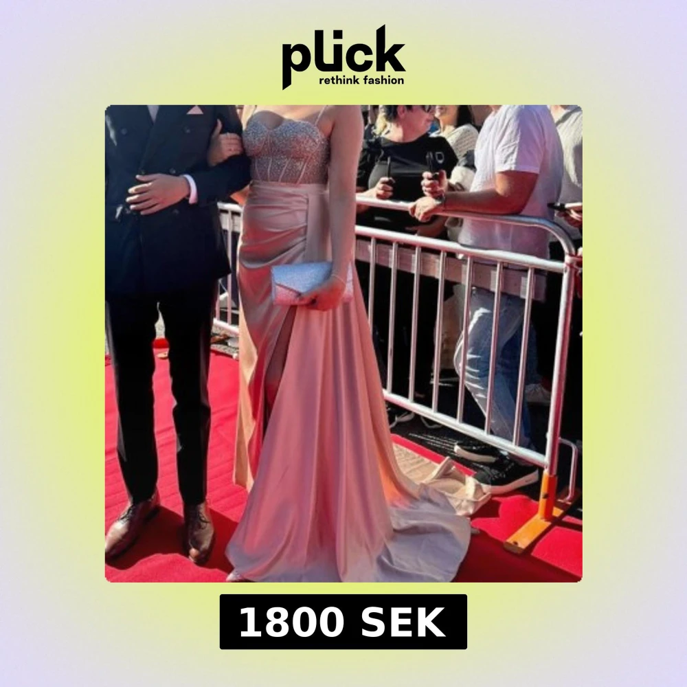 Säljer en elegant långklänning i champagnefärg med glittrig, stenarbetad överdel och axelbandslös design. Kjolen är i satinliknande material med slits framtill och omlottkänsla. Perfekt för bal eller fest. Matchande clutch kan ingå.