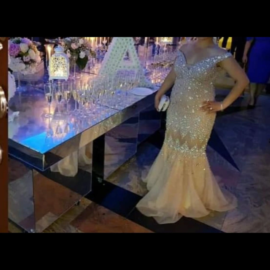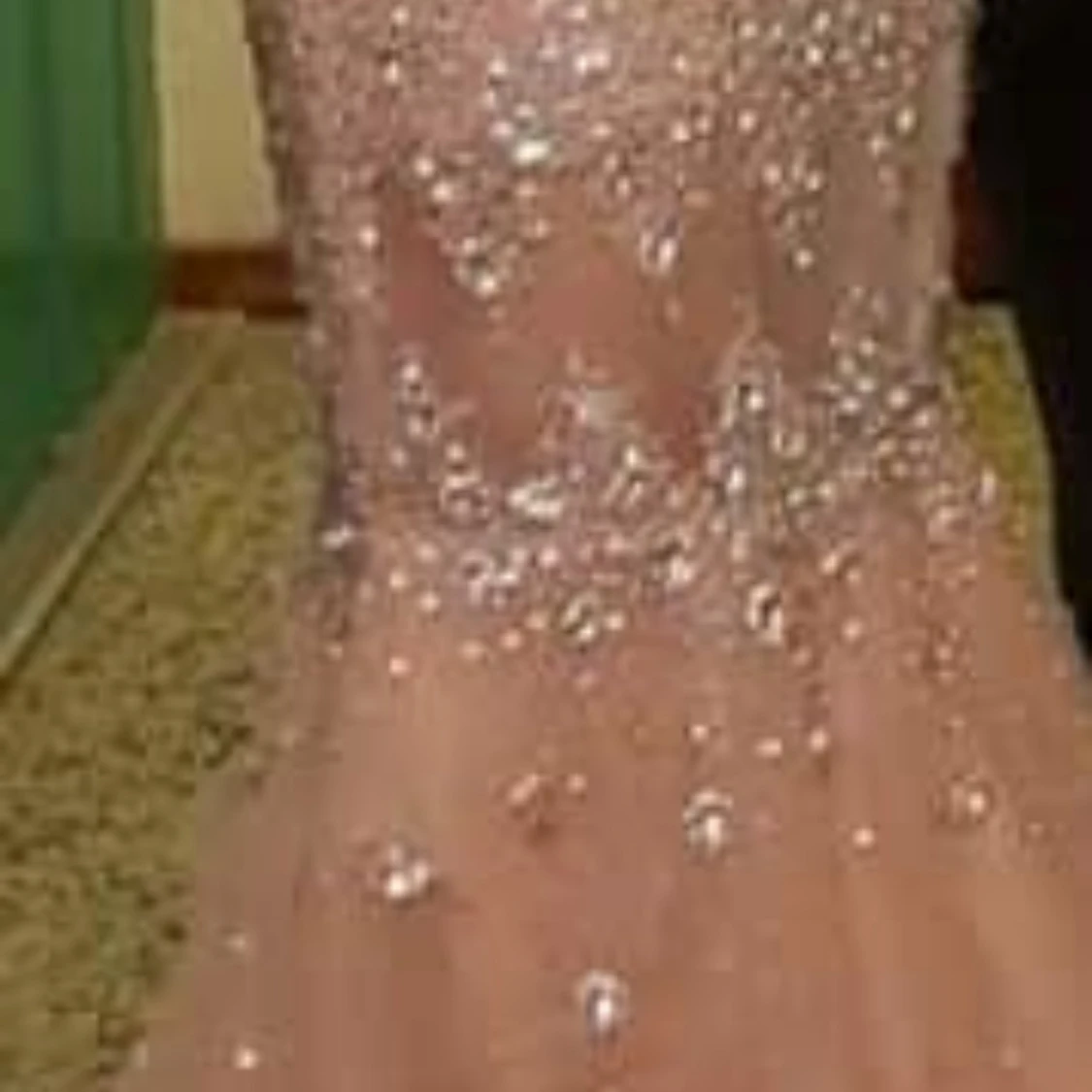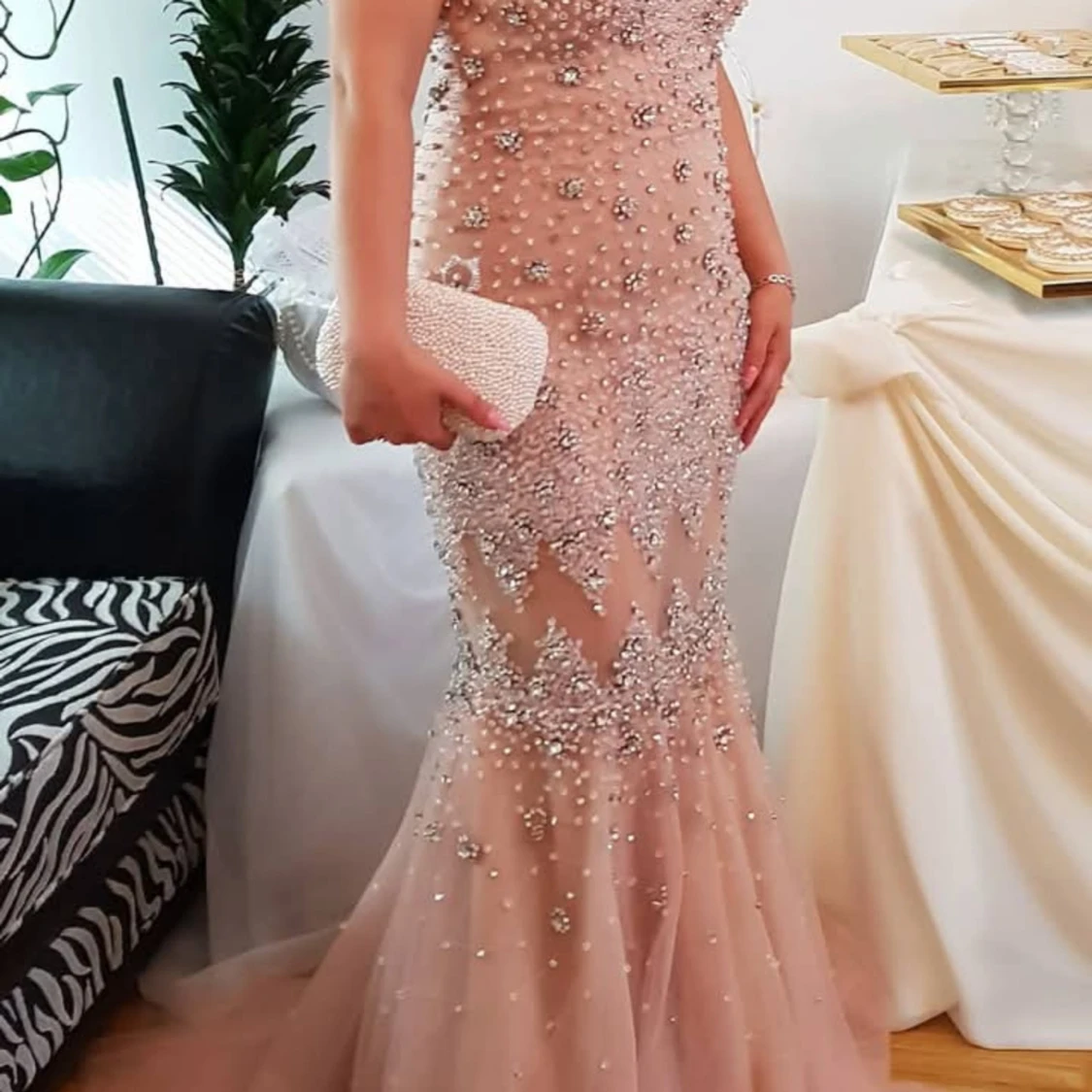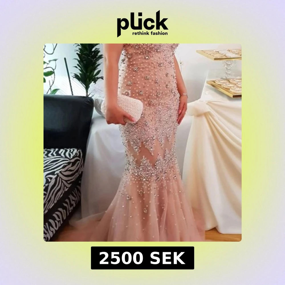Säljer en magisk champagnefärgad långklänning med glittriga paljetter och pärlor över hela klänningen. Den har en v-ringad urringning, figurnära passform och ett skirt, utsvängt släp nedtill. Perfekt för bal eller nyår, du kommer verkligen sticka ut i denna!