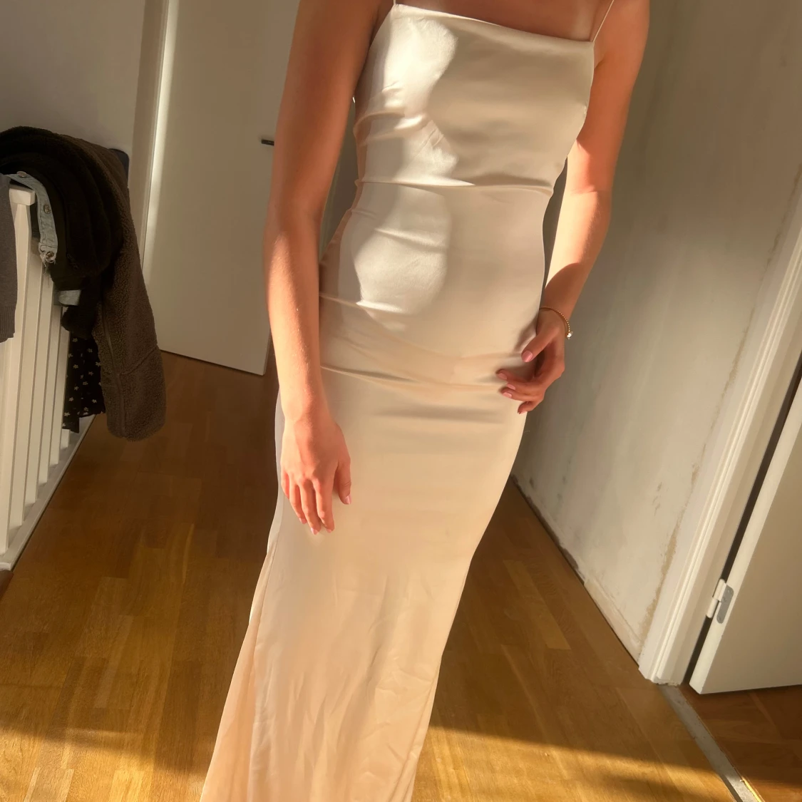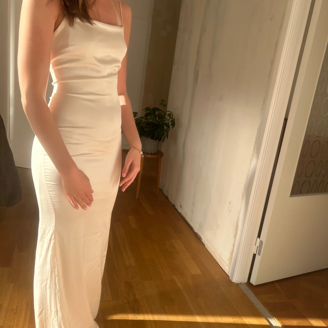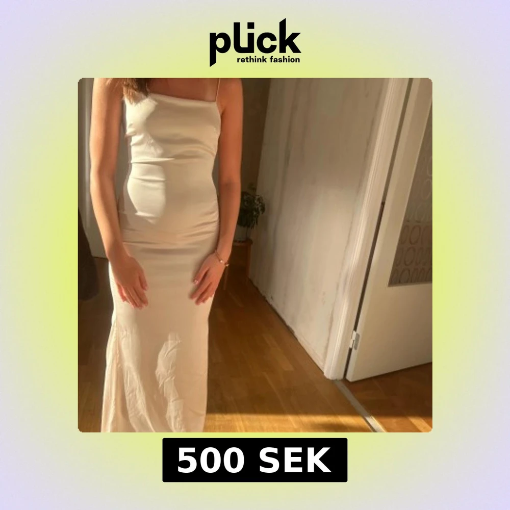 Säljer en elegant långklänning i champagnefärg, rosa vit med smala axelband och figurnära passform. Klänningen har öppen rygg. Den är från Nelly och säljs inte längre. Nypris 900kr💕storlek 34, jag bär vanligtvis S!!🥰