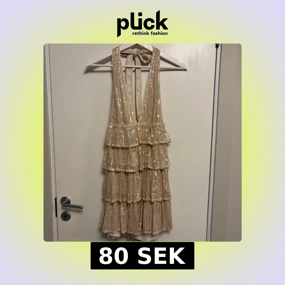Supersnygg kort klänning från SHEIN i champagnefärg med massor av paljetter och volanger. Djup v-ringning och öppen rygg med knyt i nacken. Perfekt för dig som vill sticka ut med glitter och glamour!