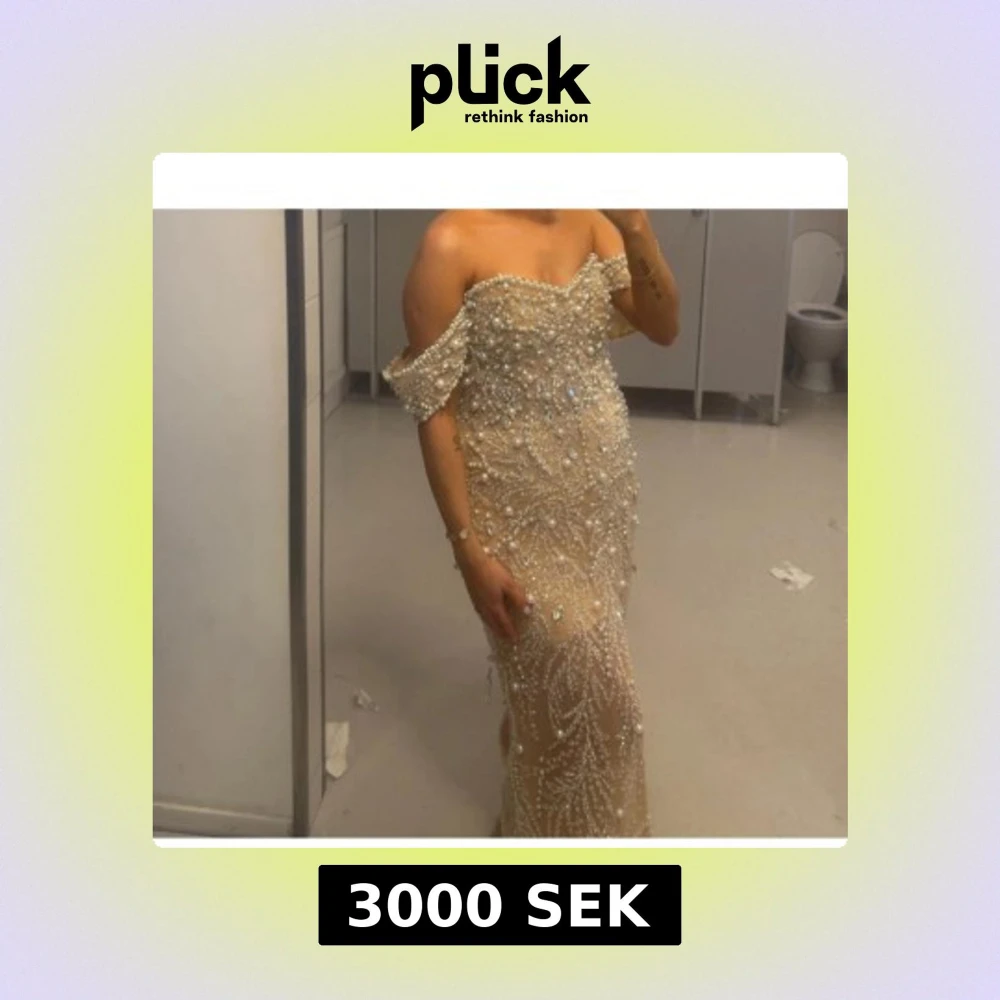 Magisk långklänning i champagnefärg med offshoulder och täckt av pärlor och glittriga detaljer. Klänningen har figurnära passform och markerad midja, perfekt för bal eller fest. Materialet är troligtvis polyester eller syntet med lyxig känsla. Pris kan diskuteras vid snabb affär