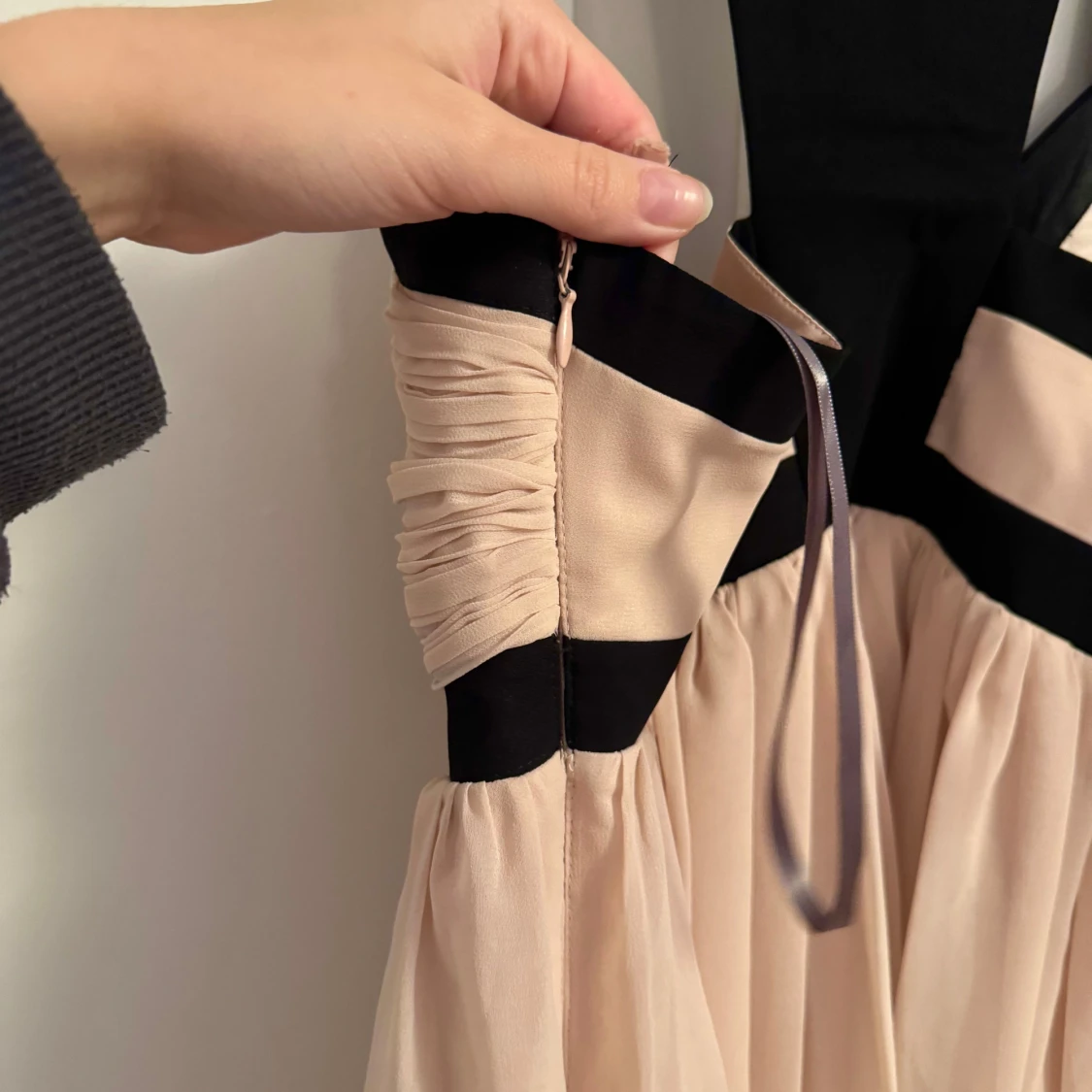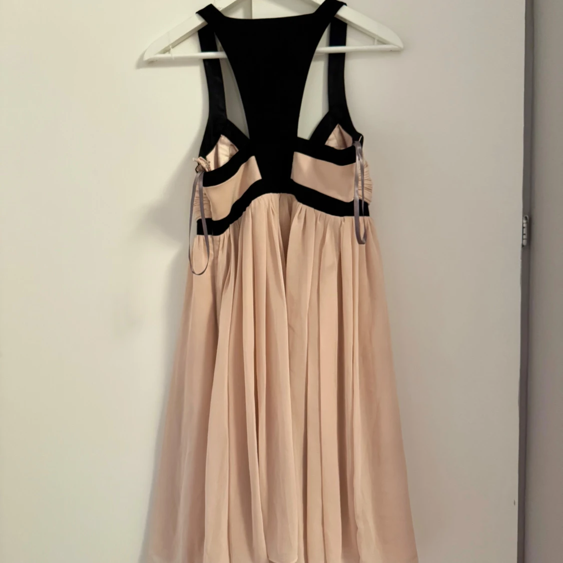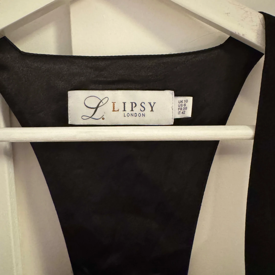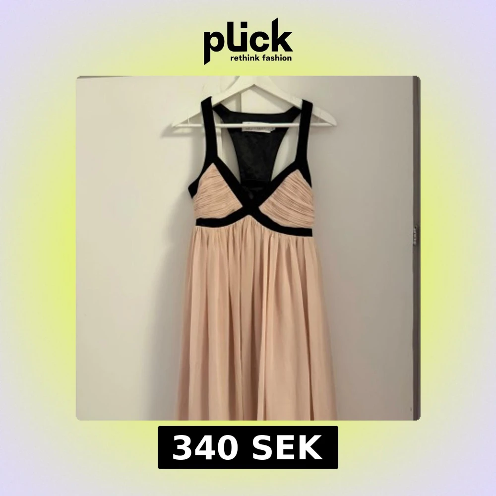 Supersnygg champagnefärgad klänning från Lipsy London med svarta kontrastdetaljer och breda axelband. Klänningen har v-ringning, markerad midja och plisserad kjol. Midi längd. Ej genomskinlig och har ett lager under. Pris odiskuterbart!!!