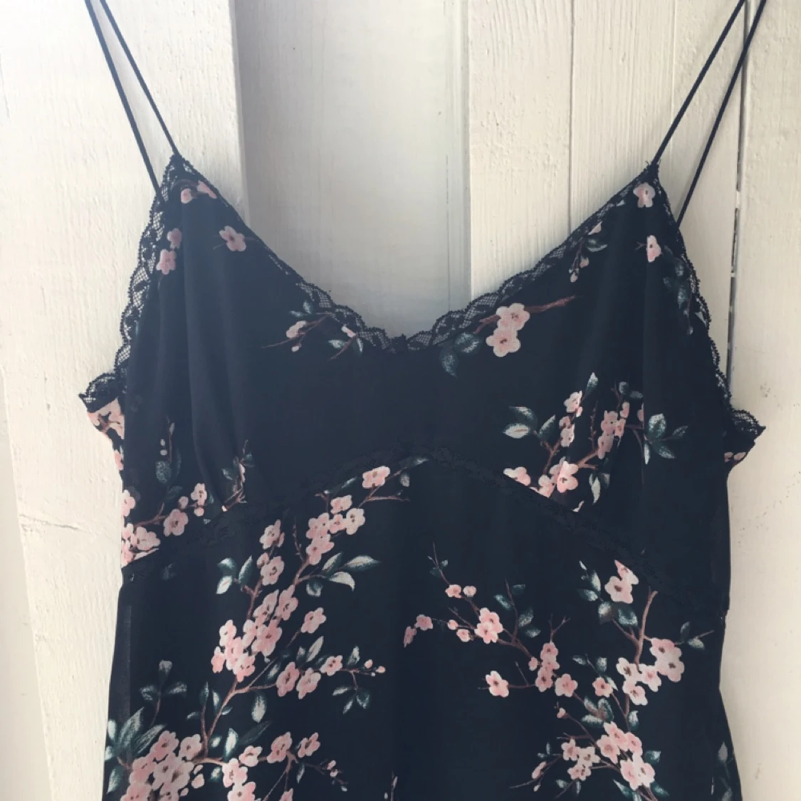 Klänning svart med rosa blommor spets i över och underkant. Även spets i avskärningen under byst. Chiffong ytter och fodrad.