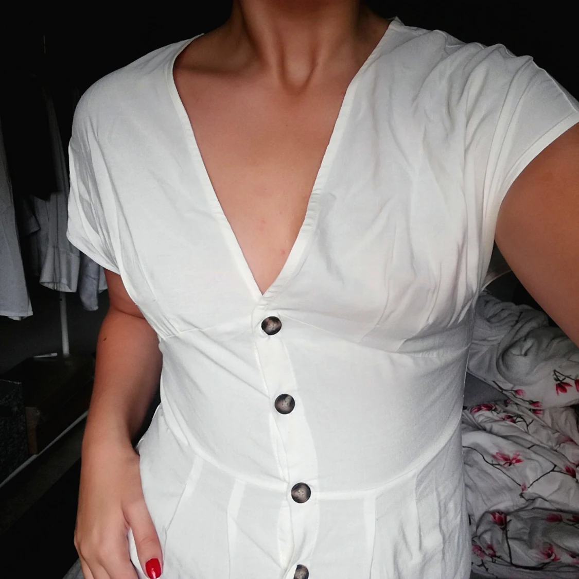 Lång klänning med knappar och en slit framtill, superhärligt material med en stan gräddvit färg. Helt ny och oanvänd med lappen kvar