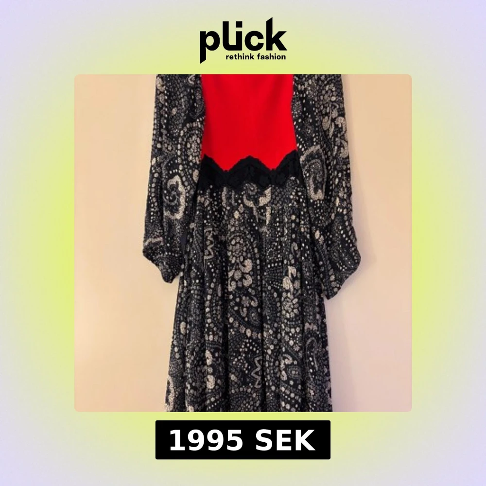 Unik midilång klänning från Chloé med röd överdel, marinblå spetsdetalj i midjan och mönstrad kjol samt ärmar i mörkblått och vitt. Klänningen har långa, vida ärmar och en elegant, feminin siluett. Perfekt skick!