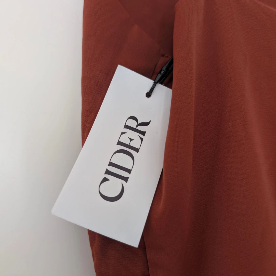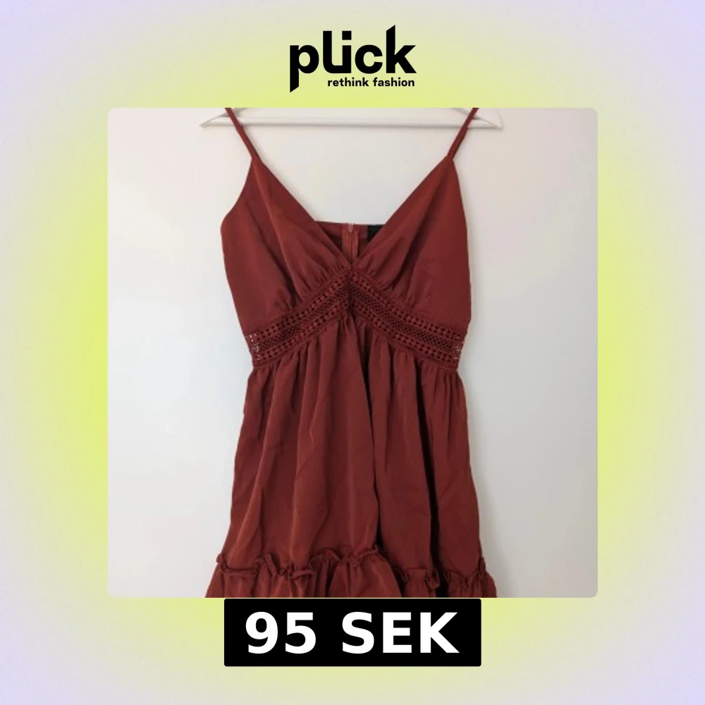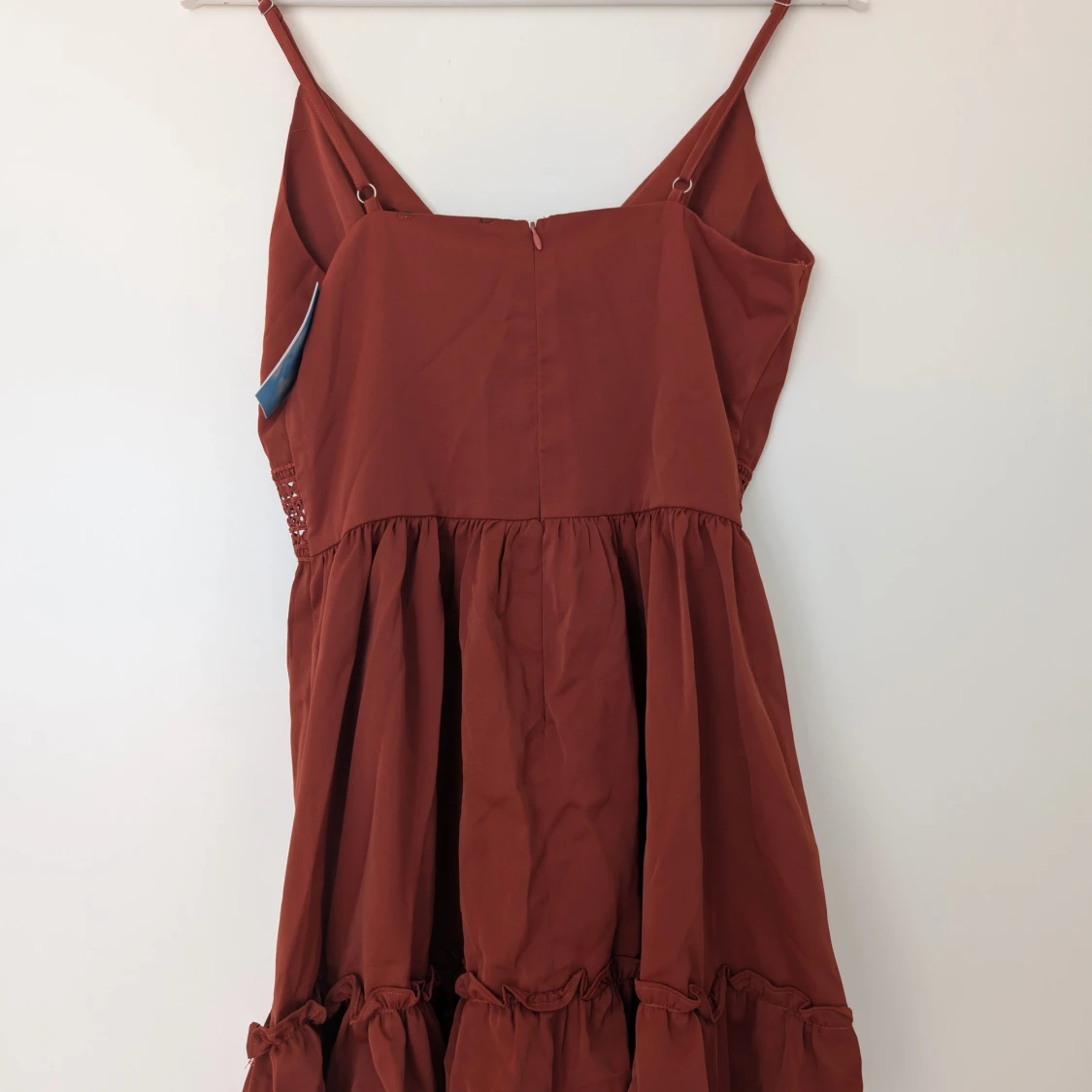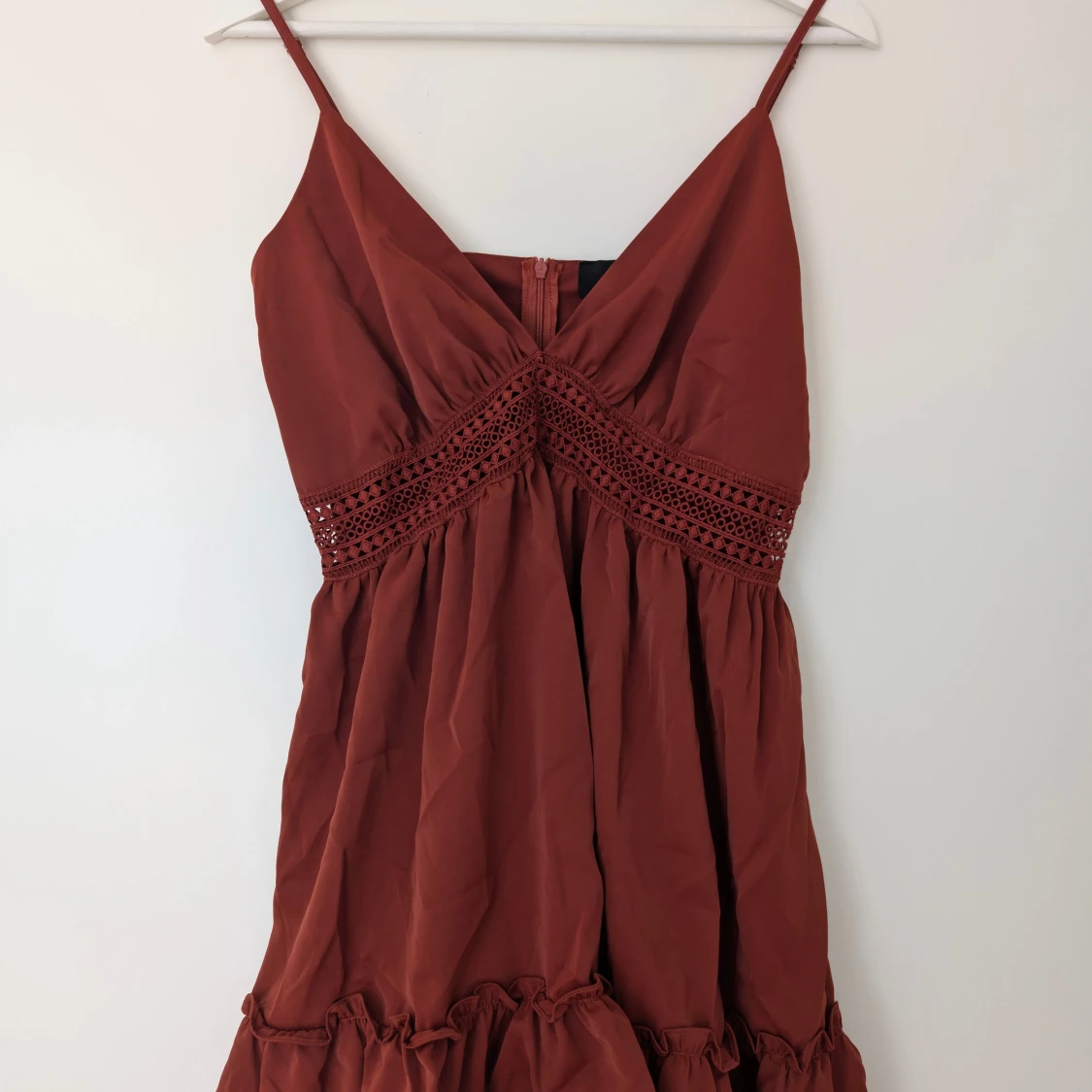 Supersöt rostbrun kort klänning från Cider med smala axelband, v-ringning och virkade detaljer under bysten. Kjolen är volangig och har en lätt rynkad effekt. Perfekt för varma dagar och ger en chill vibe.