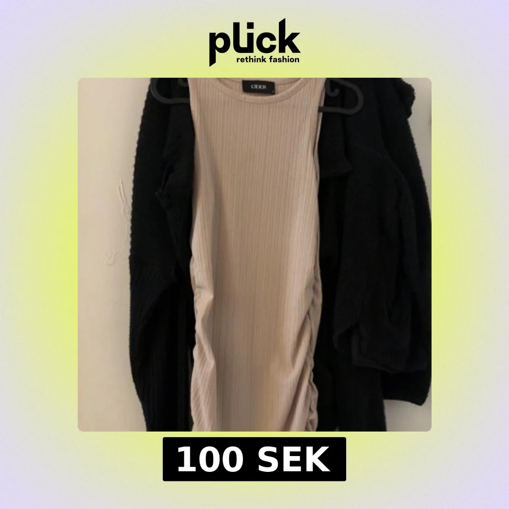 Säljer en beige ribbad klänning från Cider. Klänningen är ärmlös med rund halsringning och har en tight passform. Detaljer på sidorna