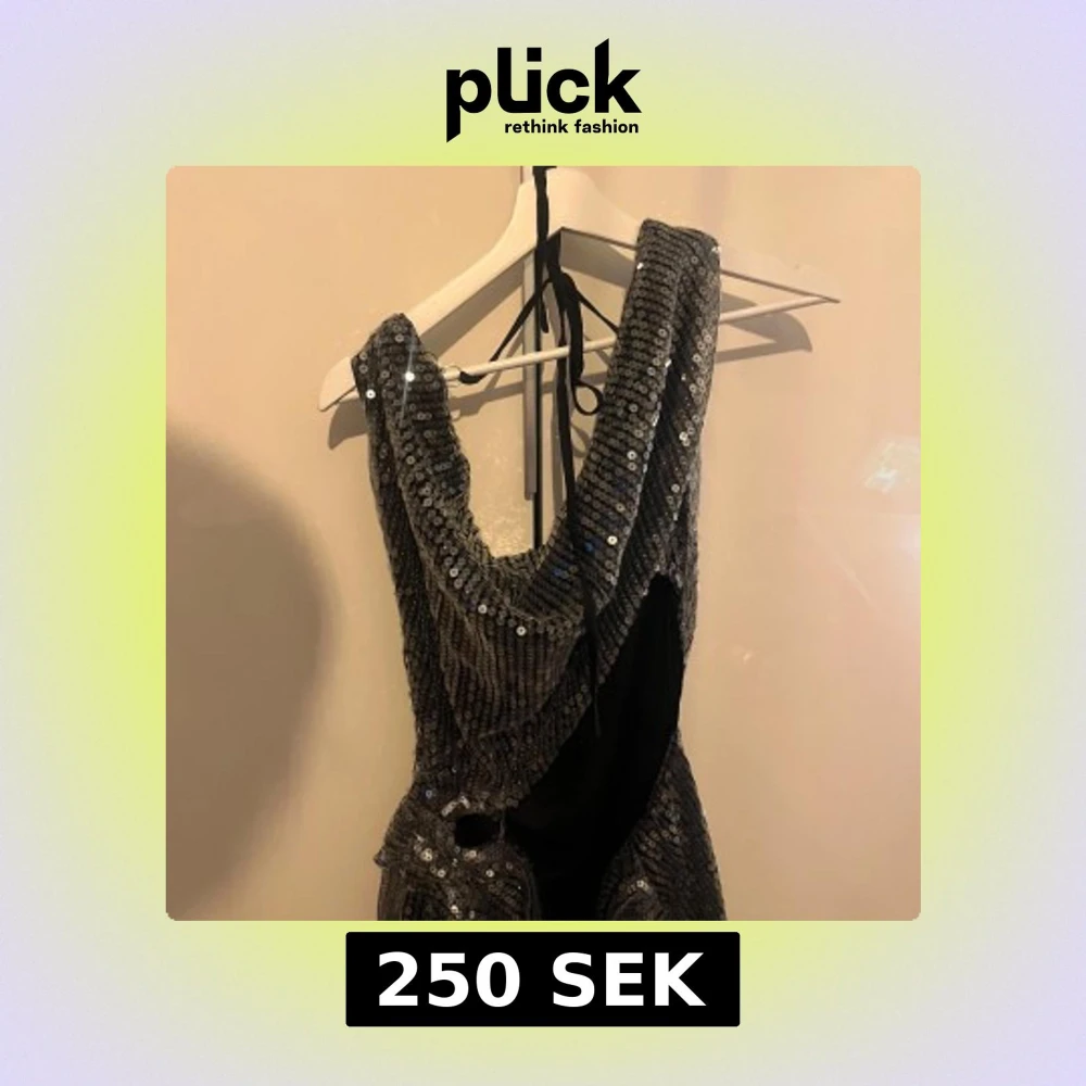 Säljer en glittrig silverfärgad klänning från Cider med paljetter och djup urringning. Klänningen har smala axelband som knyts i nacken och en snygg omlottkänsla känsla.
