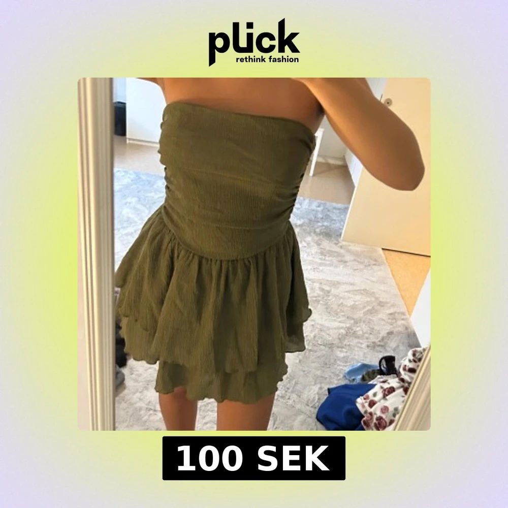Säljer en snygg grön axelbandslös kortklänning med volang i kjolen. Klänningen har en smockad överdel som sitter tight och ger en cool siluett. Perfekt för dig som gillar en enkel men trendig look. Materialet känns lätt och luftigt, perfekt för varma dagar.