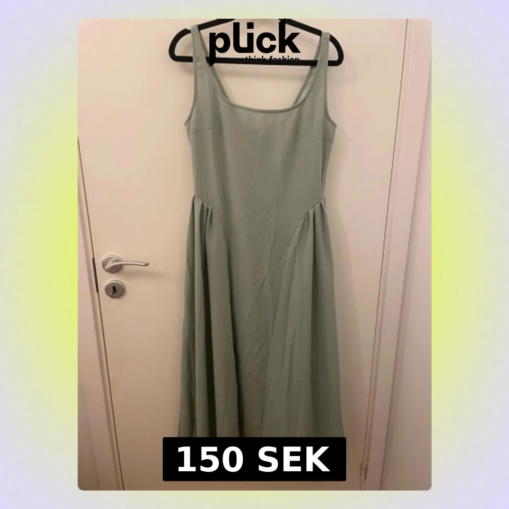 Snygg ljusgrön långklänning med breda axelband och rundad urringning. Klänningen har en markerad midja och ett lätt utställt fall. Dragkedja baktill för enkel påklädning. Materialet känns mjukt och har en slät yta.köpt ifrån Cider.