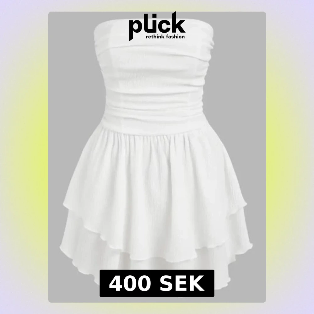 Supersöt vit kortklänning med volangkjol och smockad överdel. Axelbandslös design som ger en clean och fräsch look, perfekt för varma dagar. Klänningen har dubbla lager i kjolen för extra volym och flow. Perfekt för student eller liknande