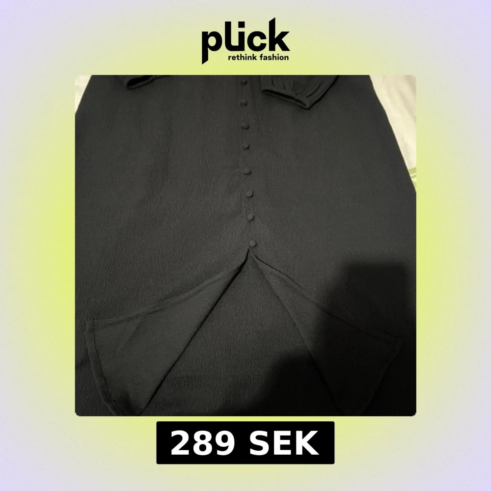 Stilren svart långklänning med långa ärmar och klädda knappar längs hela framsidan. Klänningen har en slits framtill och är tillverkad i ett lätt strukturerat tyg som ger en snygg och modern känsla. Perfekt för dig som gillar minimalistisk och elegant stil.