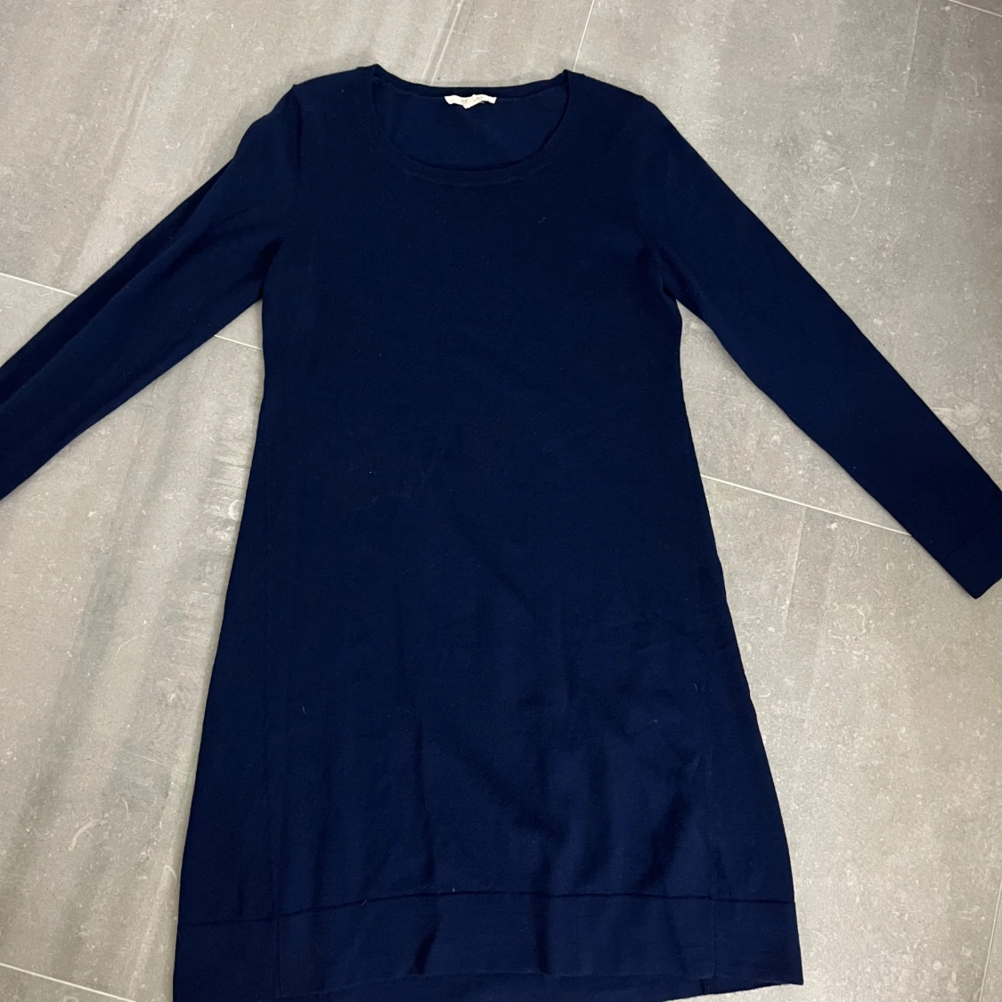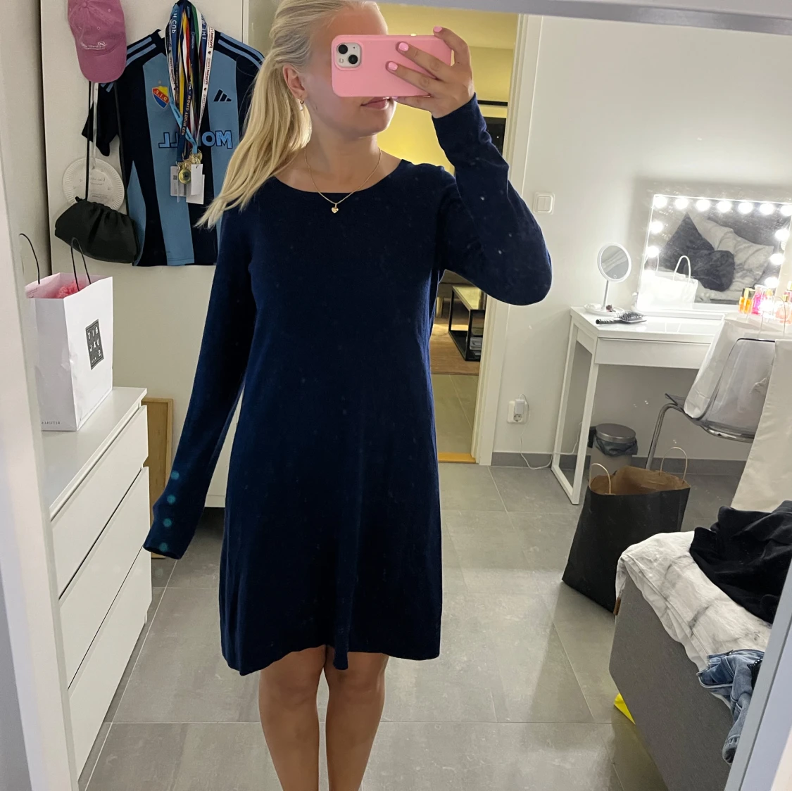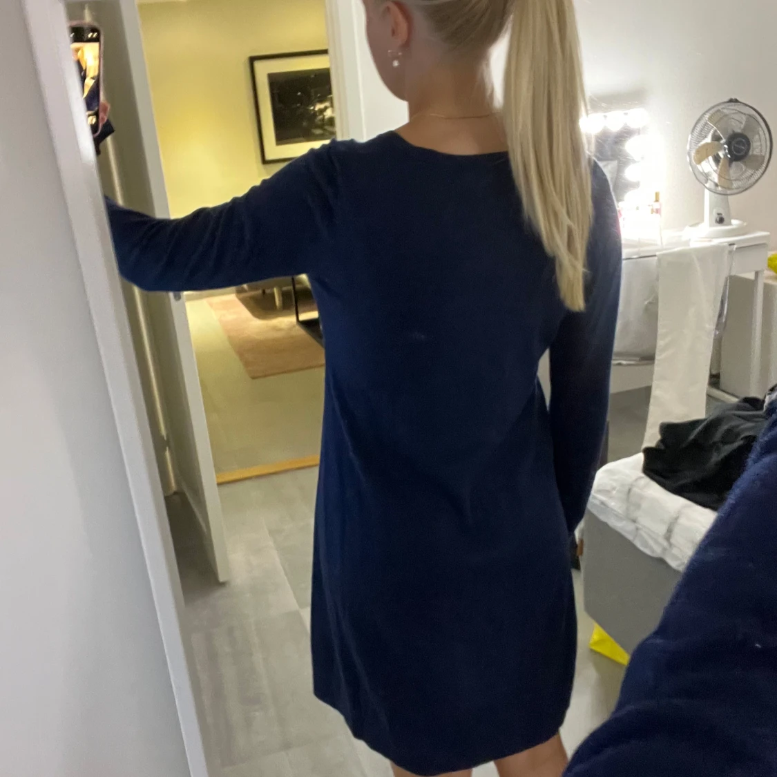 Enkel och stilren mörkblå klänning med lång ärm och rund halsringning. Modellen är rak och kort, vilket ger en avslappnad men ändå snygg look. Perfekt att styla med sneakers eller boots för en chill vibe.