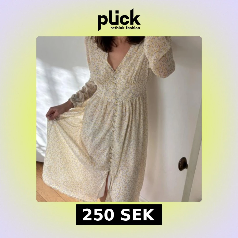 Långklänning från ONLY i ljusgul och vitblommigt mönster. Klänningen har v-ringning, knappar framtill, långa transparenta ärmar och ett flowigt fall. Knappt använd och utan slitage.