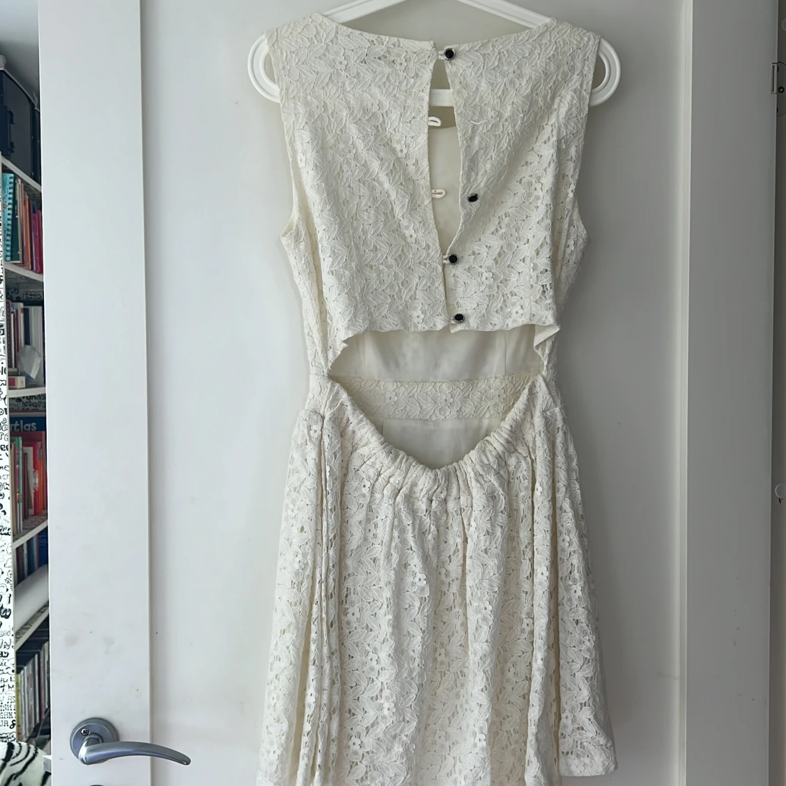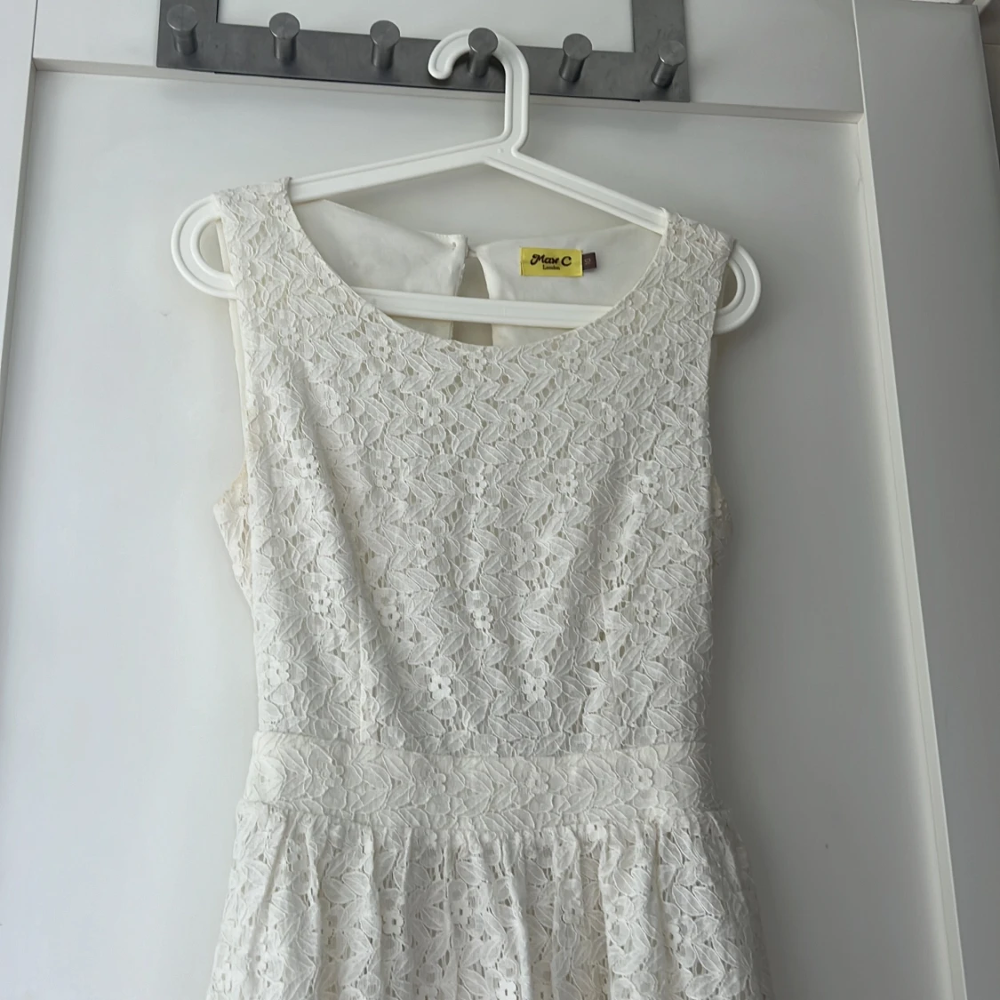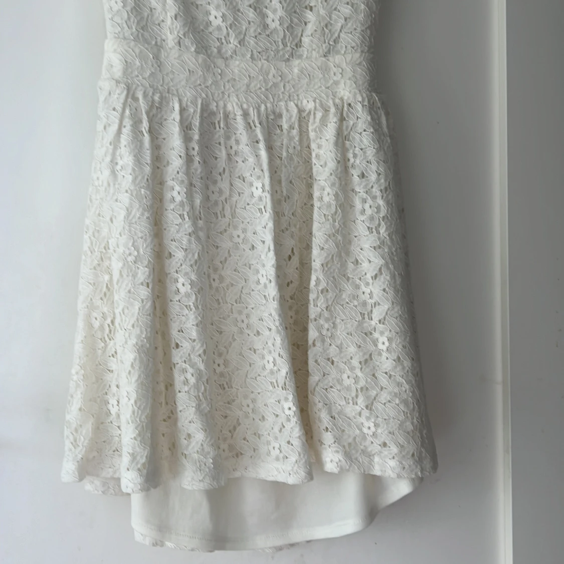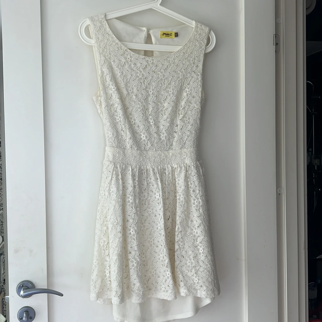 En coquette vit spetsklänning med ärmlös design och rund halsringning. Klänningen har en öppen rygg med knappar och en kort längd. Perfekt för sommar och fest tillfällen.