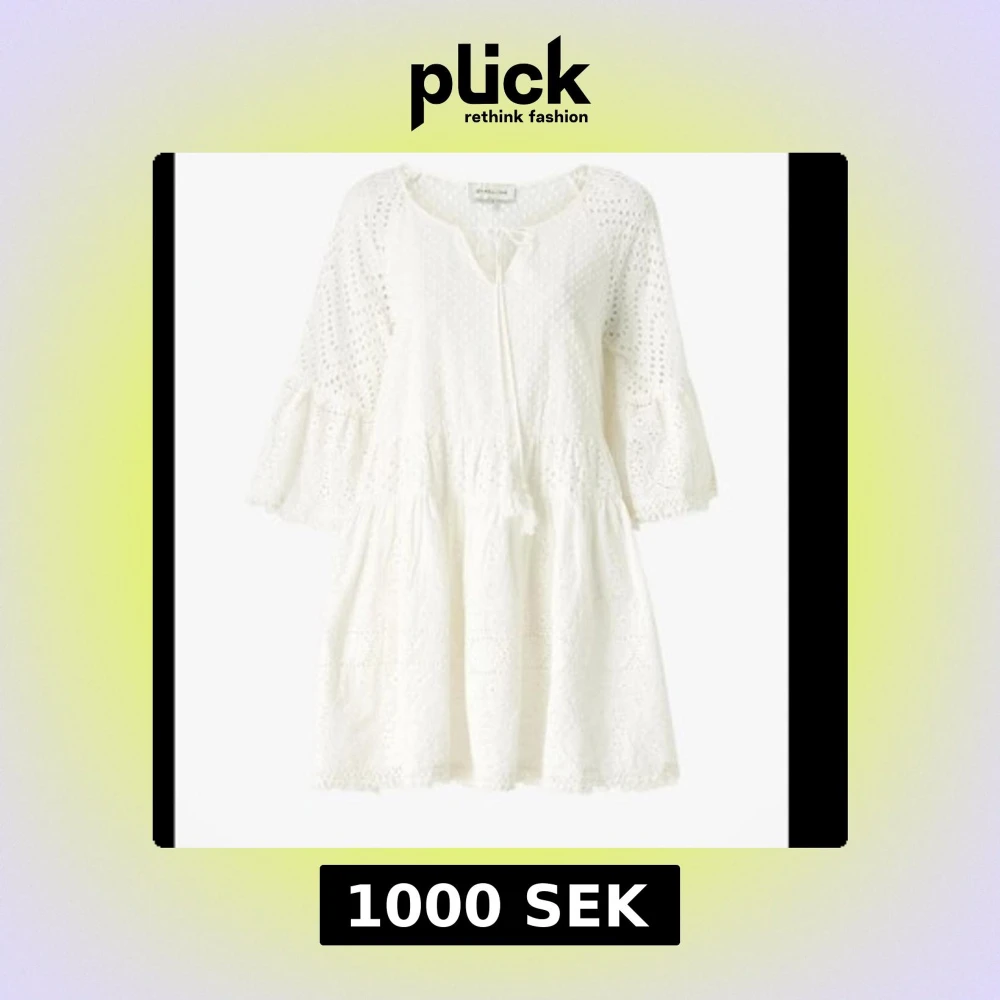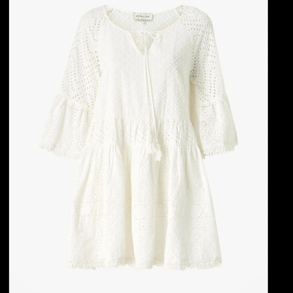 Superfin vit kortklänning från By Malina med broderade detaljer och trekvartsärm. Klänningen har knytning vid halsen och är tillverkad i bomull, perfekt för sommarens alla tillfällen. Passar även s/m! Nypris 2000kr