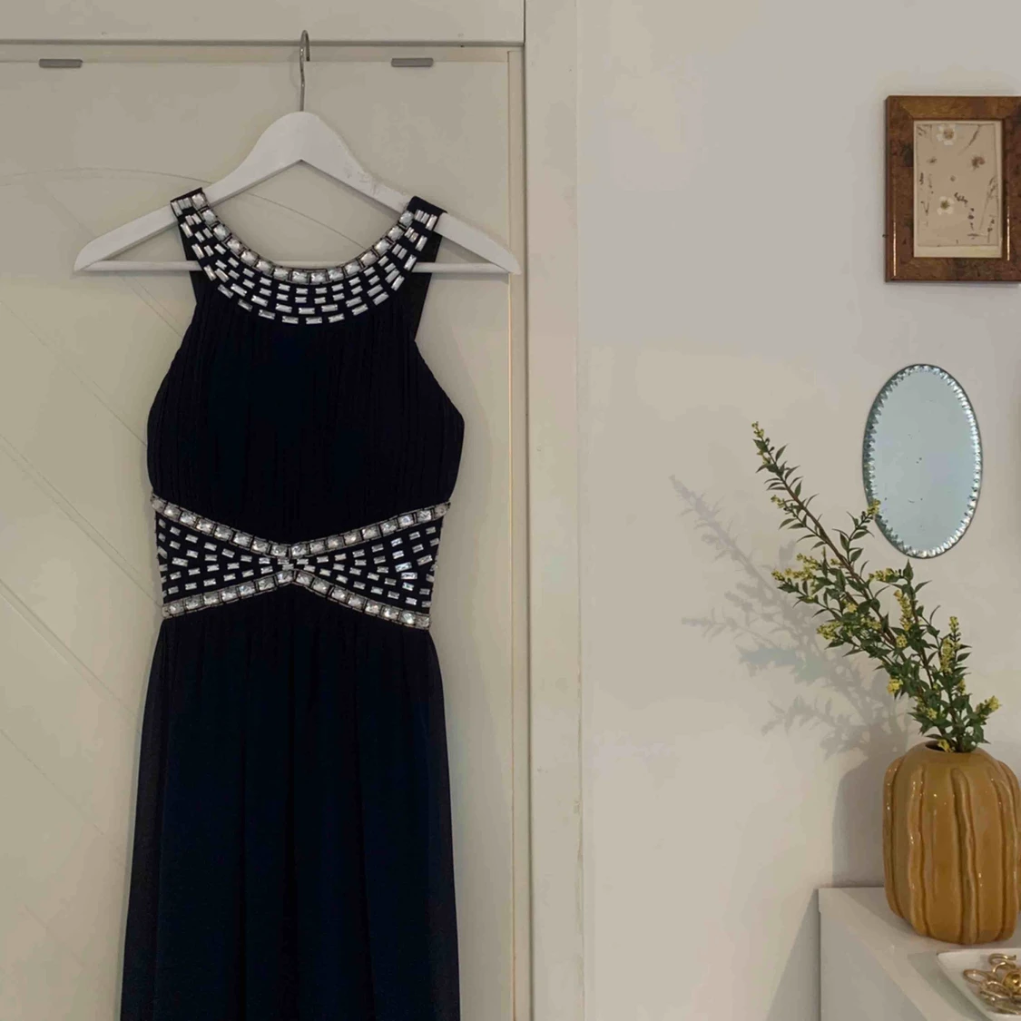 Balklänning i en marinblå/mörkblå färg (ser nästan svart ut på bilderna men den är blå). Tyget i ryggen är stretchigt så tror att den kan passa upp till M, själv har jag S. Endast använd två gånger. Frakt tillkommer.