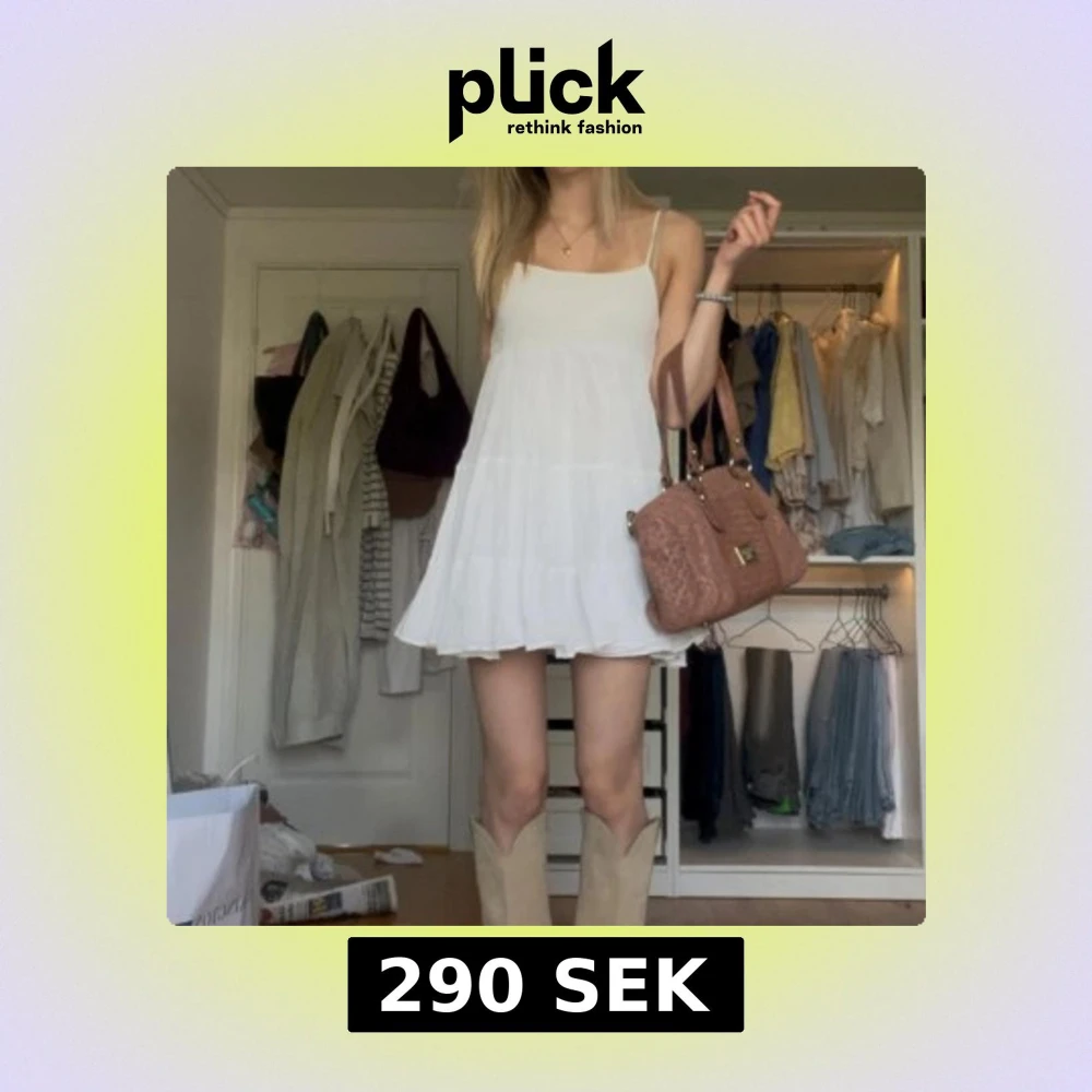 Supersöt vit kort klänning med tunna axelband och volangig kjol. Den har en luftig och flowy passform, perfekt för varma dagar. Klänningen är ärmlös och har en enkel, stilren look som känns både fräsch och trendig.