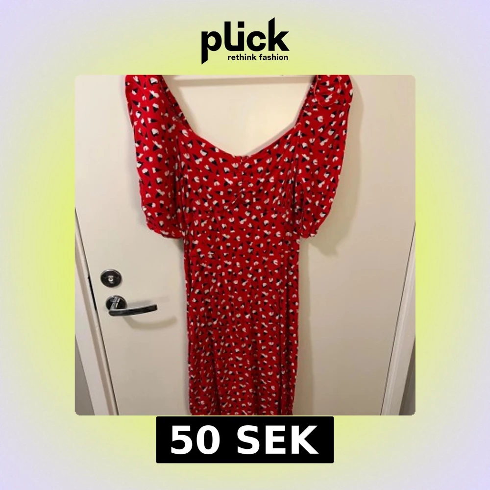 Röd klänning med vita och svarta detaljer, puffiga kortärmar och rundad halsringning. Klänning stängs med en dragkedja i sidan och har även slits vid sidan. Väldigt fin på! Använd 1 gång.