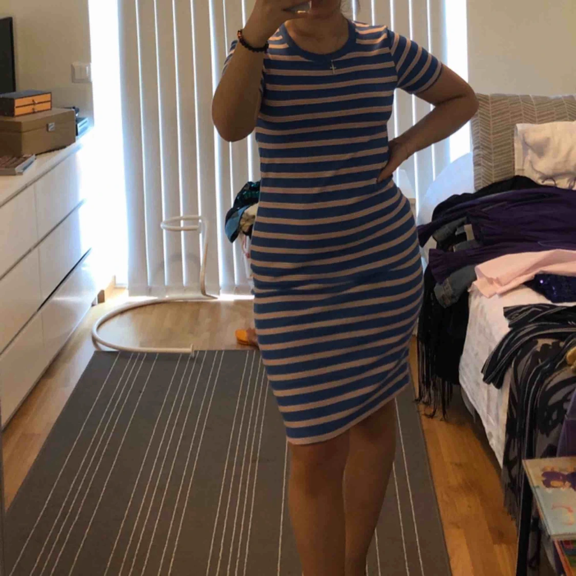 Blå/orange/vit randig klänning från Cubus i storlek S men den är väldigt stretchig så den skulle kunna passa någon som bär storlek M. Klänningen är använd några gånger men o fint skick. Köparen står för frakt. <3