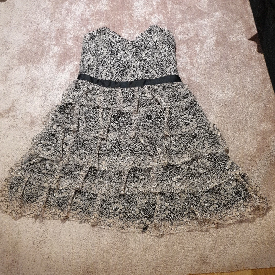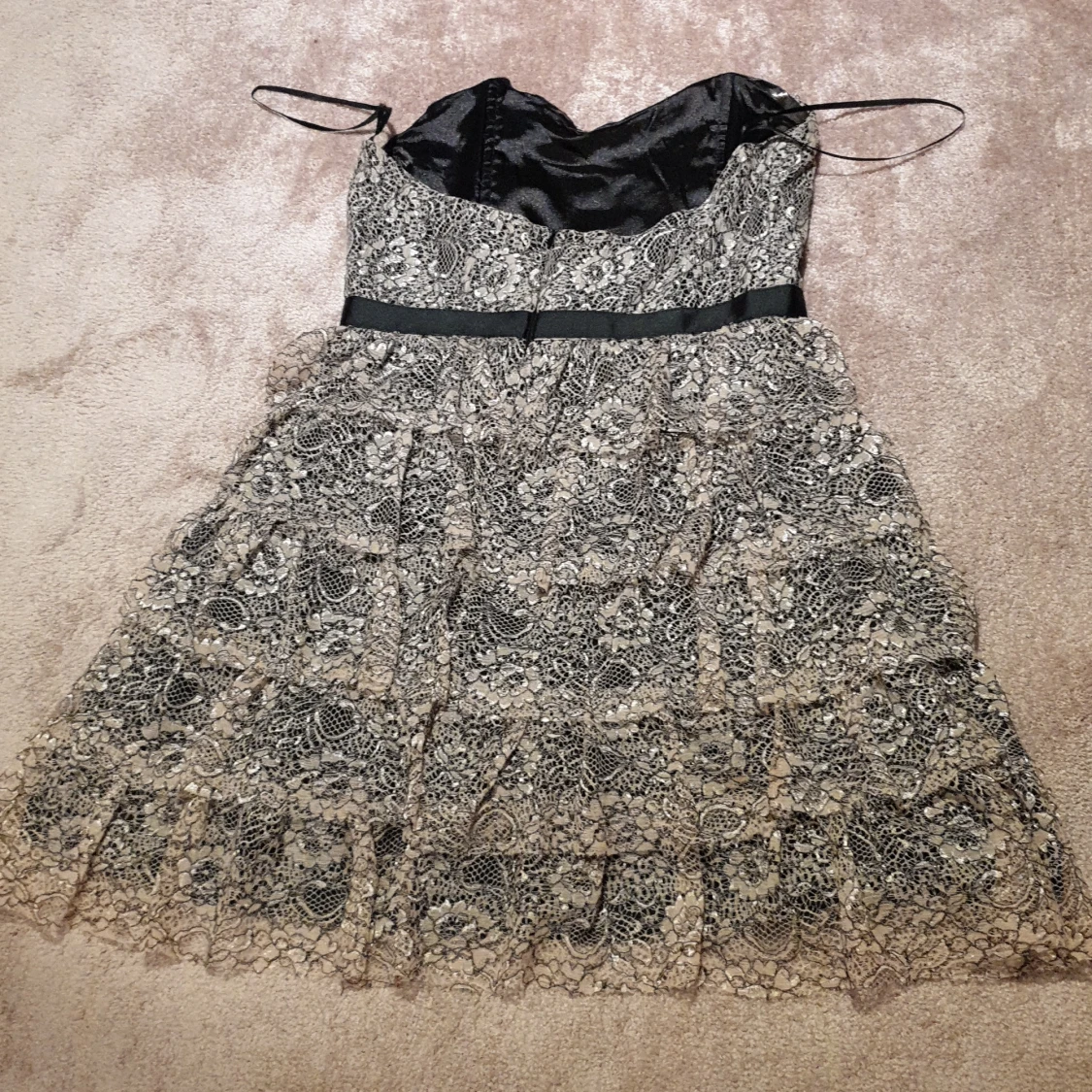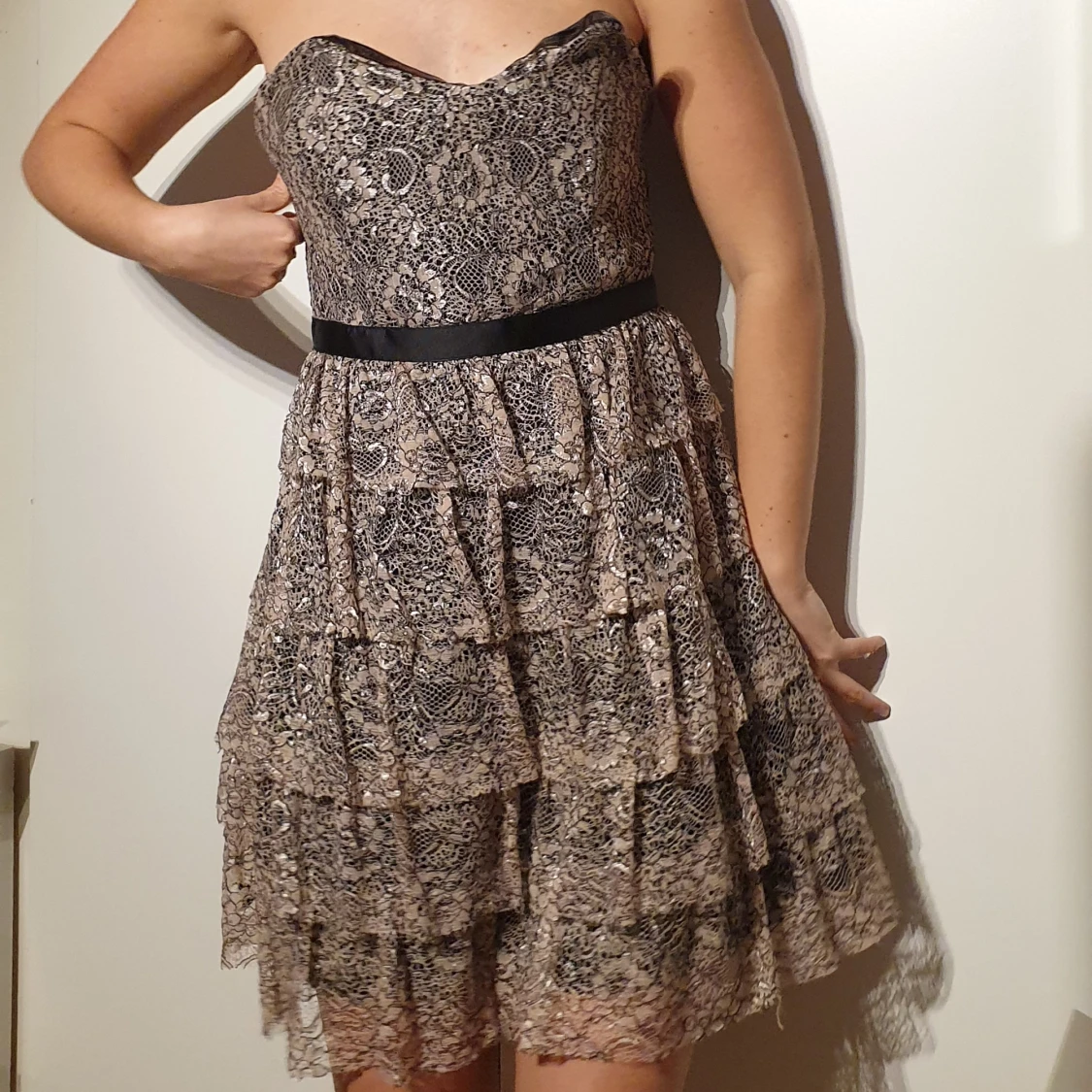 Beige, brun, svart kort volangklänning. Lite större över bysten med tajt kedja kring midjan, passar storlek M också. Polyester. I gott skick.