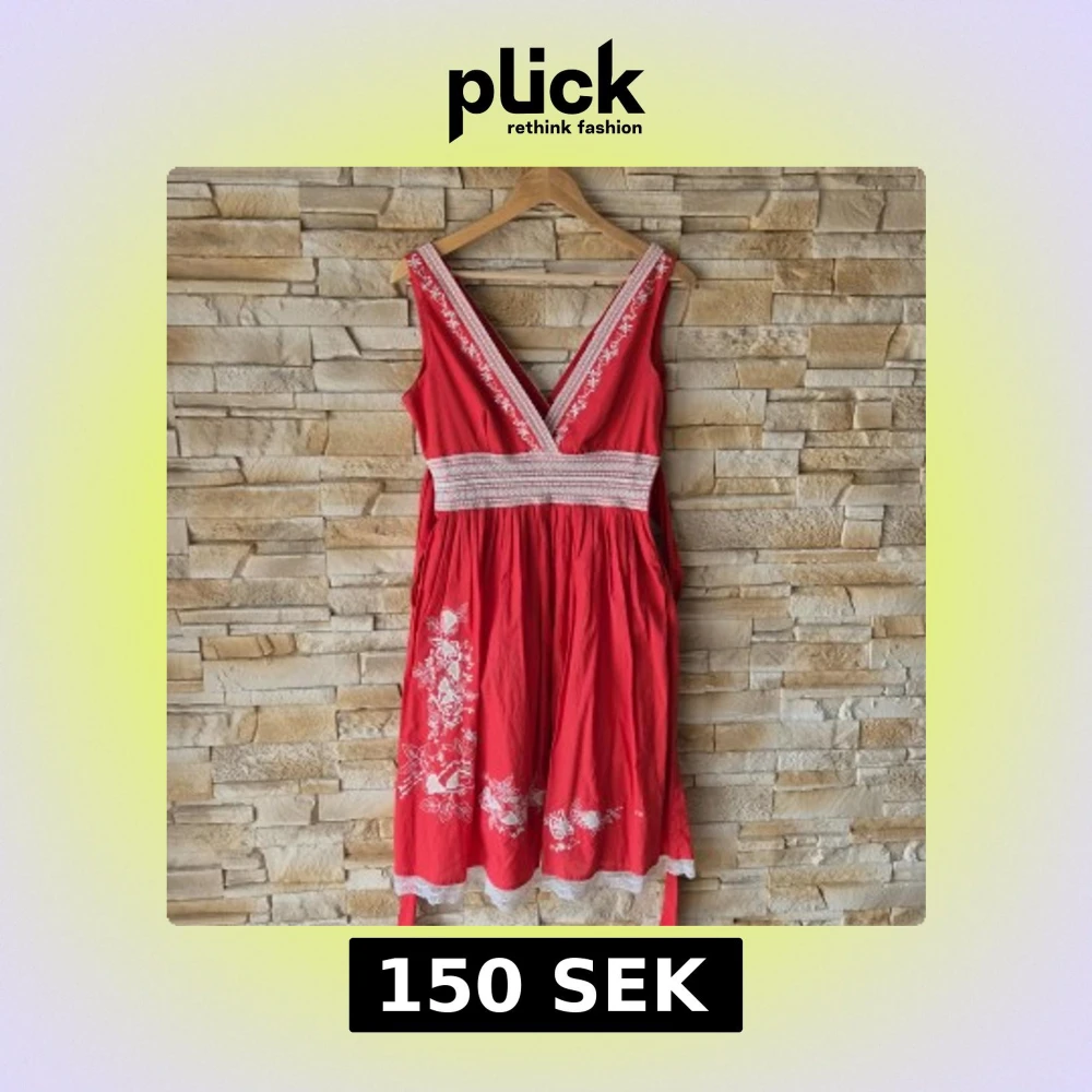 Superfin röd klänning från Derhy med vita broderade blommor och spetsdetaljer. Djup v-ringning med broderad kant. Klänningen har ärmlös design och vackra broderier längs kjolen och ringningen. Perfekt för sommarens tillfällen! Blixlåsen behöver fixas
