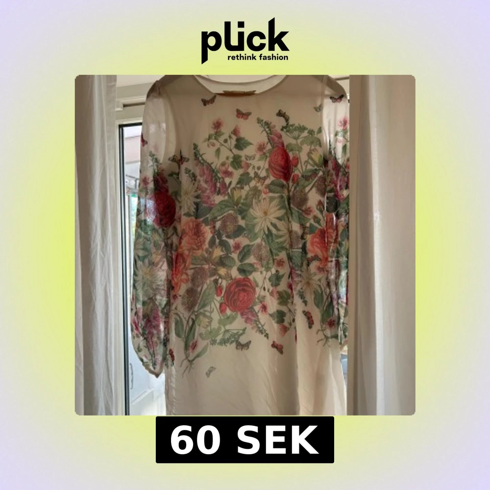 Säljer en transparent blus från Yumi med färgglatt blommönster och fjärilar. Blusen har långa ärmar och rund halsringning. Perfekt för dig som vill ha något unikt och färgstarkt i garderoben!