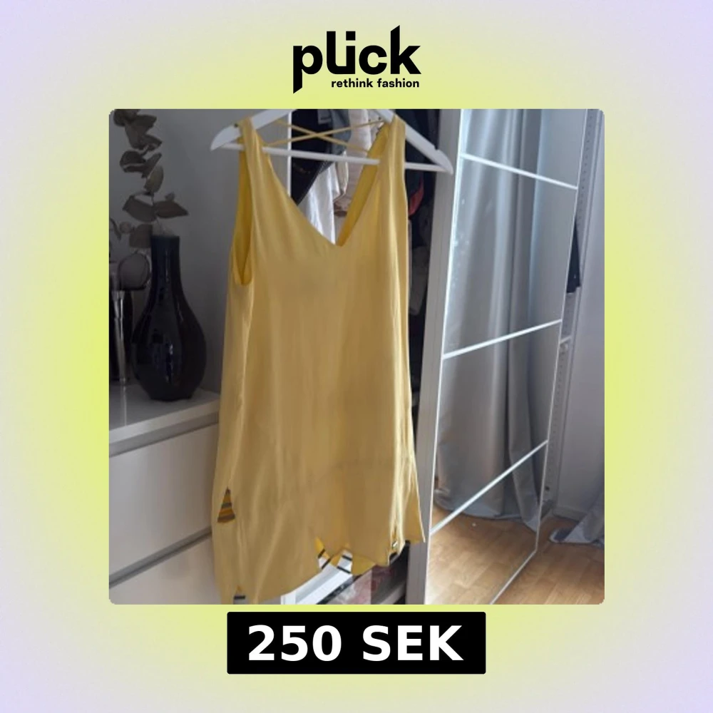 Säljer en solgul ärmlös klänning från Animale med v-ringning och ojämn nederkant. Klänningen har en luftig passform och är perfekt för varma dagar. Materialet känns lätt och svalt mot huden. ny pris 2000kr
