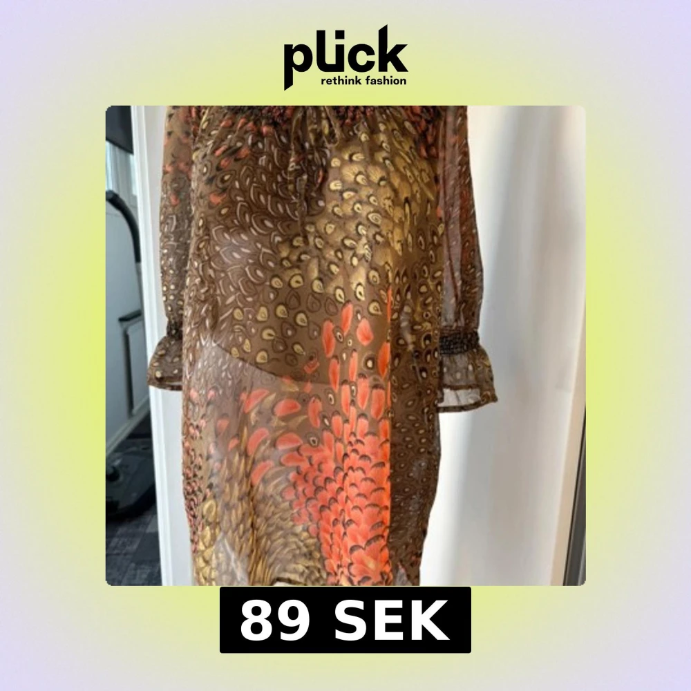 Säljer en luftig och transparent klänning/tunika från Isolde med unikt fjäderinspirerat mönster i brunt, orange och beige. Klänningen har trekvartsärmar med resår och volangdetalj samt knytning vid halsen. Perfekt för dig som gillar bohemisk stil.