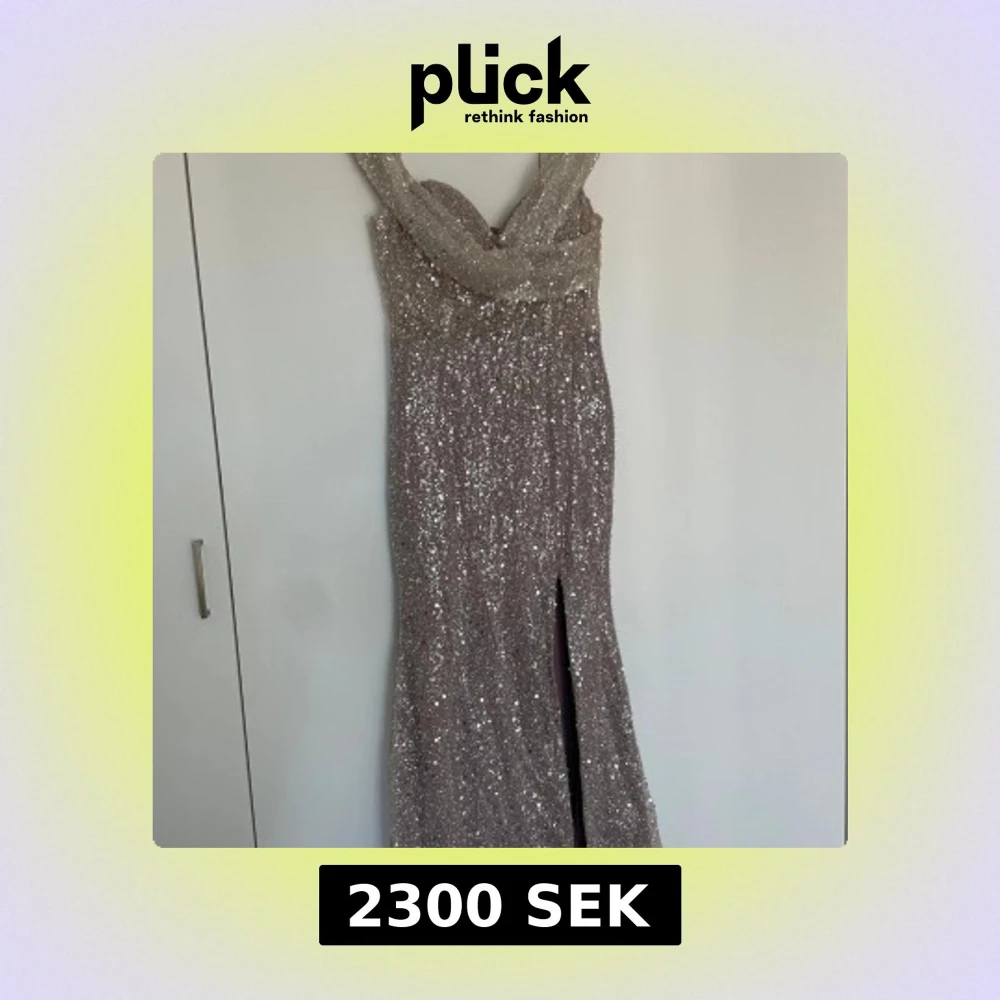 Säljer en elegant långklänning i champagnefärg med glittriga paljetter över hela klänningen. Modellen har omlott-detalj vid axlarna, v-ringad urringning och en snygg slits framtill. Perfekt för bal eller fest! Materialet är syntet med paljetter & pärlor för extra glam. Den är lite tyngd med ett litet släpp.