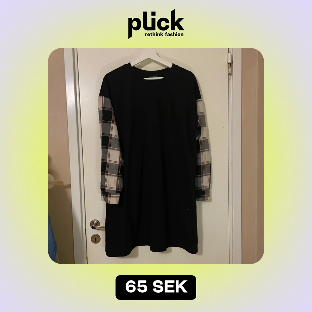 Säljer en svart klänning från Shein med supercoola rutiga ärmar i svart och vitt. Klänningen har en avslappnad passform och är perfekt för höst och vinter. Den är långärmad och gjord i ett mjukt material som känns skönt mot huden.
