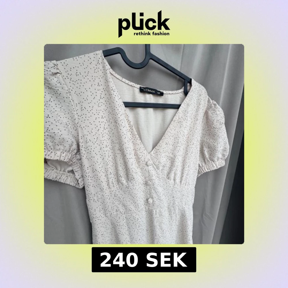 Supersöt ljus långklänning från Stinna med små svarta prickar, v-ringning och puffärmar. Klänningen har knappar framtill och resår vid ärmslut. Perfekt för sommarens alla tillfällen!